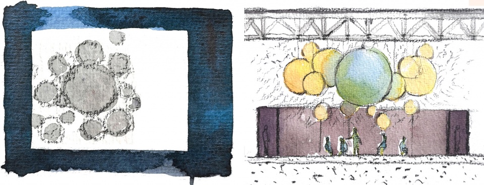 二十九只球体由一圈宽窄不一的围廊围起,十六只球体由天空垂下,十三只球体由地面冉冉升起,建筑空间内的人群则仿若各自处于不同量子态的费米子,穿梭游离在这方星辰空间中。灯亮,围廊内院则成了“天地呼应,众星拱极”之景。同时,展演现场的表演也利用了主体群星球体与三张幕布之间的空间互动以及光影互动关系。