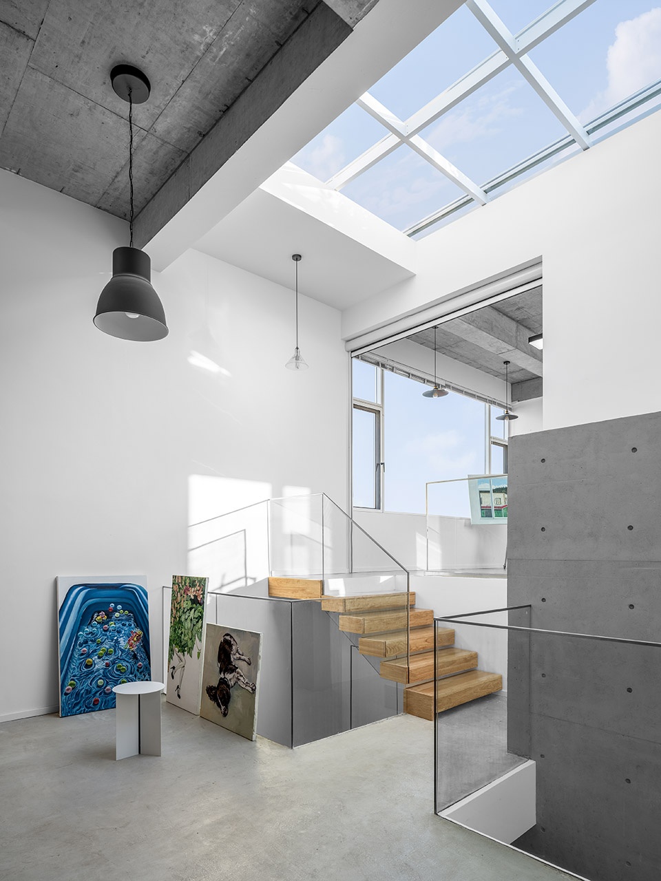 To increase the communication between the people who live inthisbuilding and prevent the spaces on each floor from being overseparated, in the design, the staggered floors and the empty space are combined togetherbetweenthesecond floor to the fourth floor. On one hand, peoplecan see each otheron each floor. On the other hand, through the1.5 times floor height, that the space perception of the living room is improved and large paintings can be hung in the studio.The air pressure difference generated by empty and split-layer, windows at different heights, and indoor temperature differences strengthens the flow of indoor air and makes the space more ventilated and breathable in the meantime.
