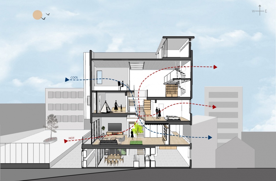 由于建筑的地形是长方形,有接近13米的进深。二层以下的空间除了正西面外,其他立面基本与邻居相连,为了避免日后周边建筑的重建会挡住了大部分的采光。在建筑的中部区域设置为主要的垂直交通,并把除了楼梯和走道以外的所有位置做成挑空空间,结合屋顶对应的天窗,让光线可以从建筑的中部的照射到空间中,增加内部的光线。同时起居室面向的正西侧,利用冬夏季节日照角度的不同,把起居室往后退缩了阳台的位置,让夏天的光线不会直射到起居室,而冬天的时候又能感受到一丝午后的暖阳。