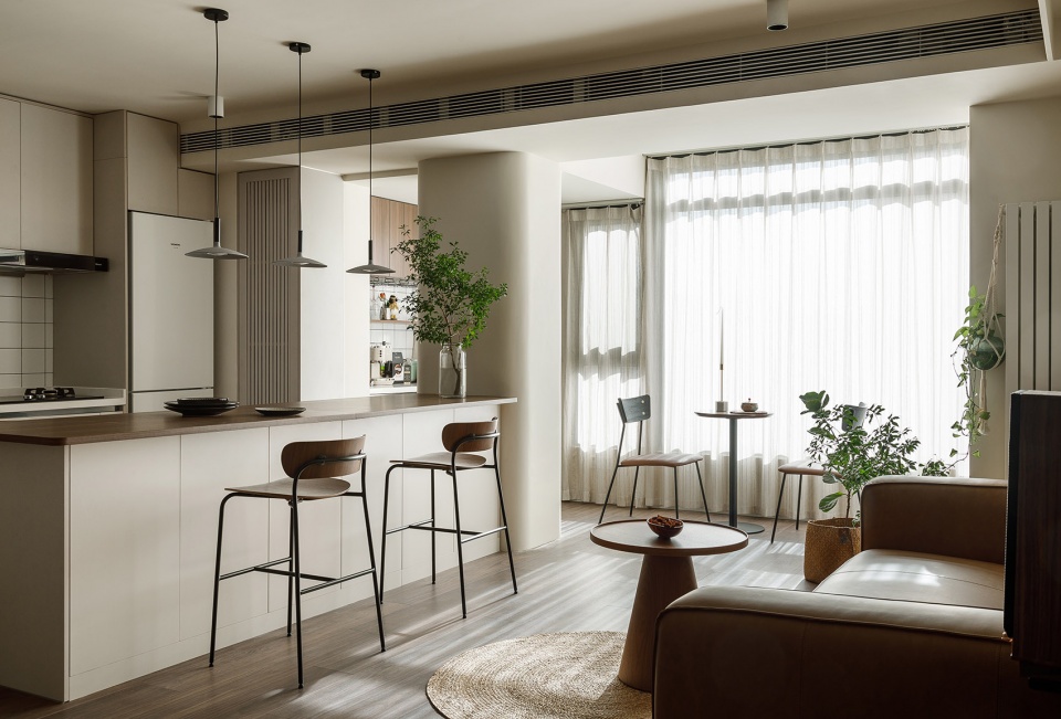 吧台结合承重墙体形成空间中岛,形成客厅、餐厅、厨房和阳台的大洄游动线,美食、美酒和咖啡围绕它展开。