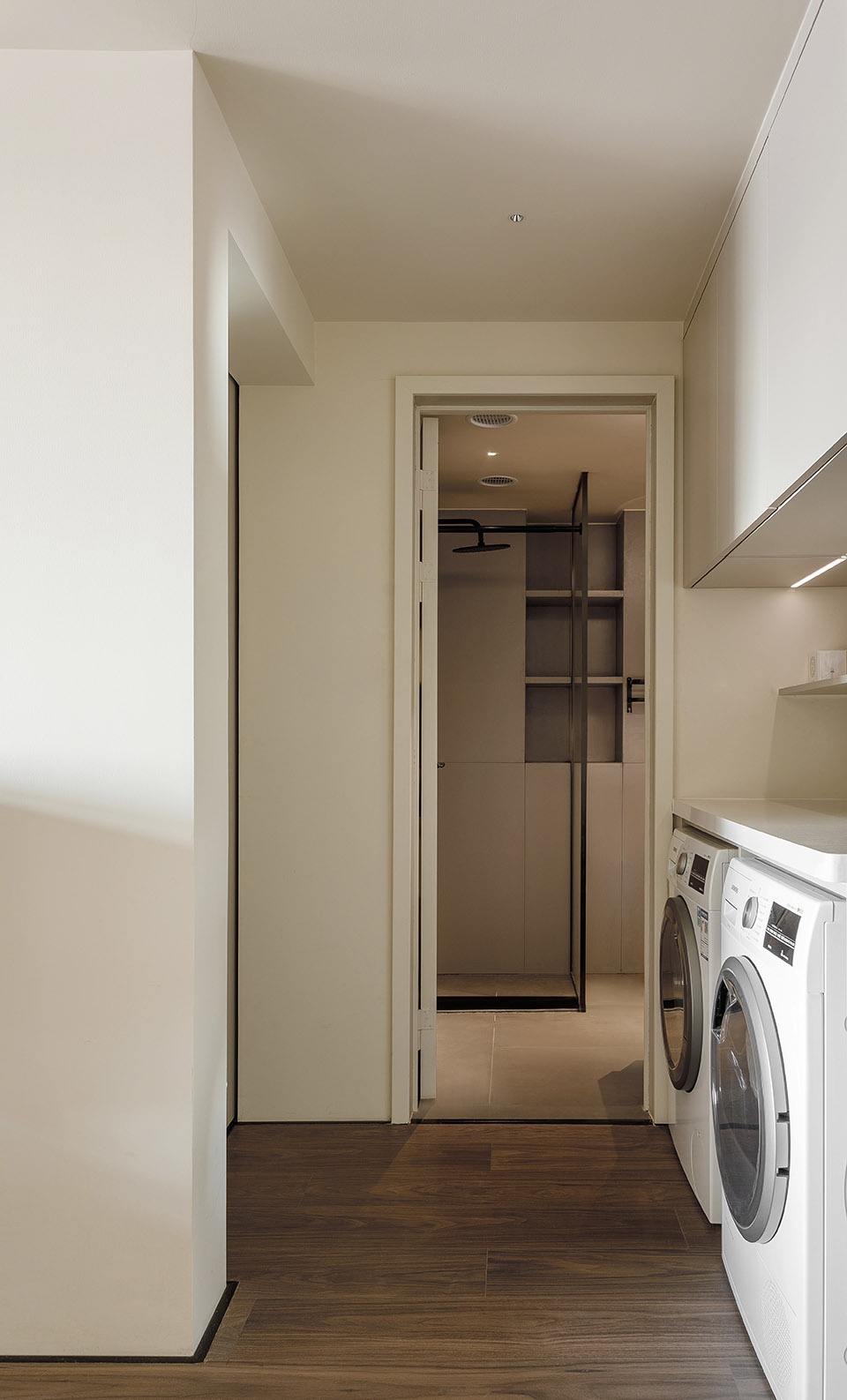 1. 将入户换鞋、挂衣的收纳柜体和烘洗机背靠背组合在一起,把玄关区、家政区安置 在采光较弱的北向进门处。