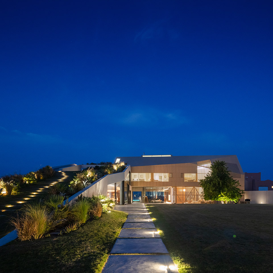 The ‘guesthouse’, wedges between two landscapes, is connected to it at multiple levels: The living quarters (living, dining, open kitchen, and library have their façade) on the ground floor, the sleeping quarters (master suite, three ensuite guest bedrooms, a sitting area, and pantry) – via a courtyard alongside the guest bedrooms façade – on the first floor, and the clay studio via a roof garden.