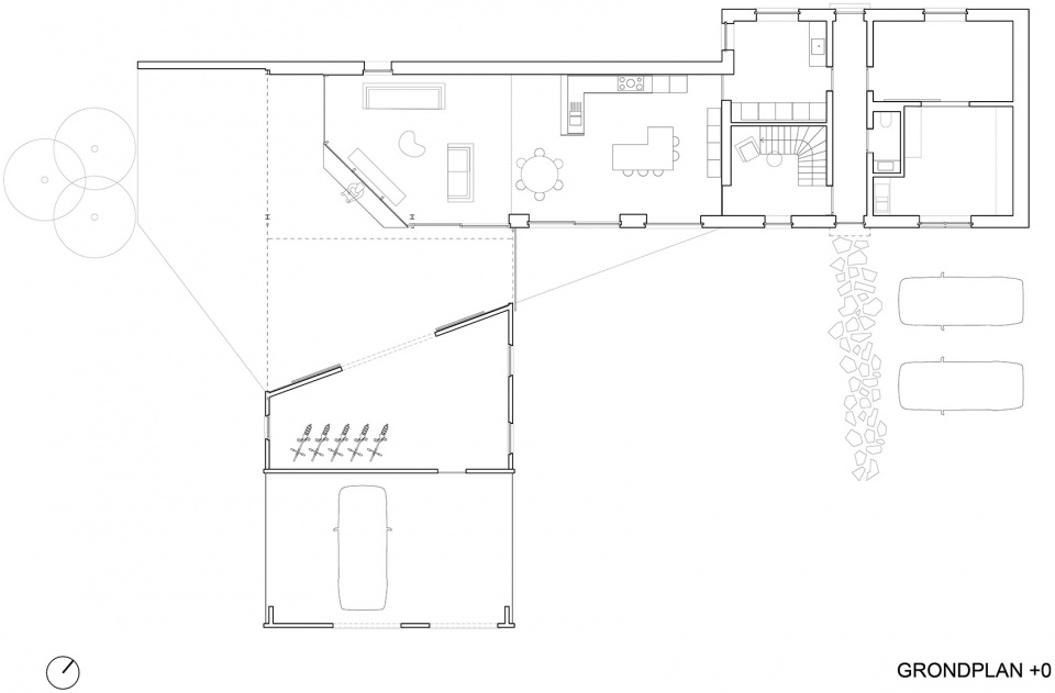 The thoughtful introduction of a covered outdoor space in this design created openness to the garden and added value for all volumes on the plot. The triangular terrace forms the core of a new living and outdoor experience, of which even the bicycle shed/cider workshop is now an integral part.
