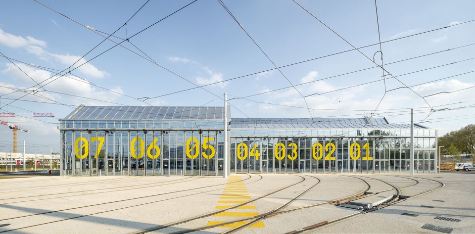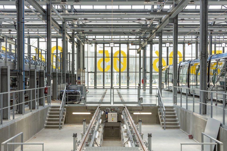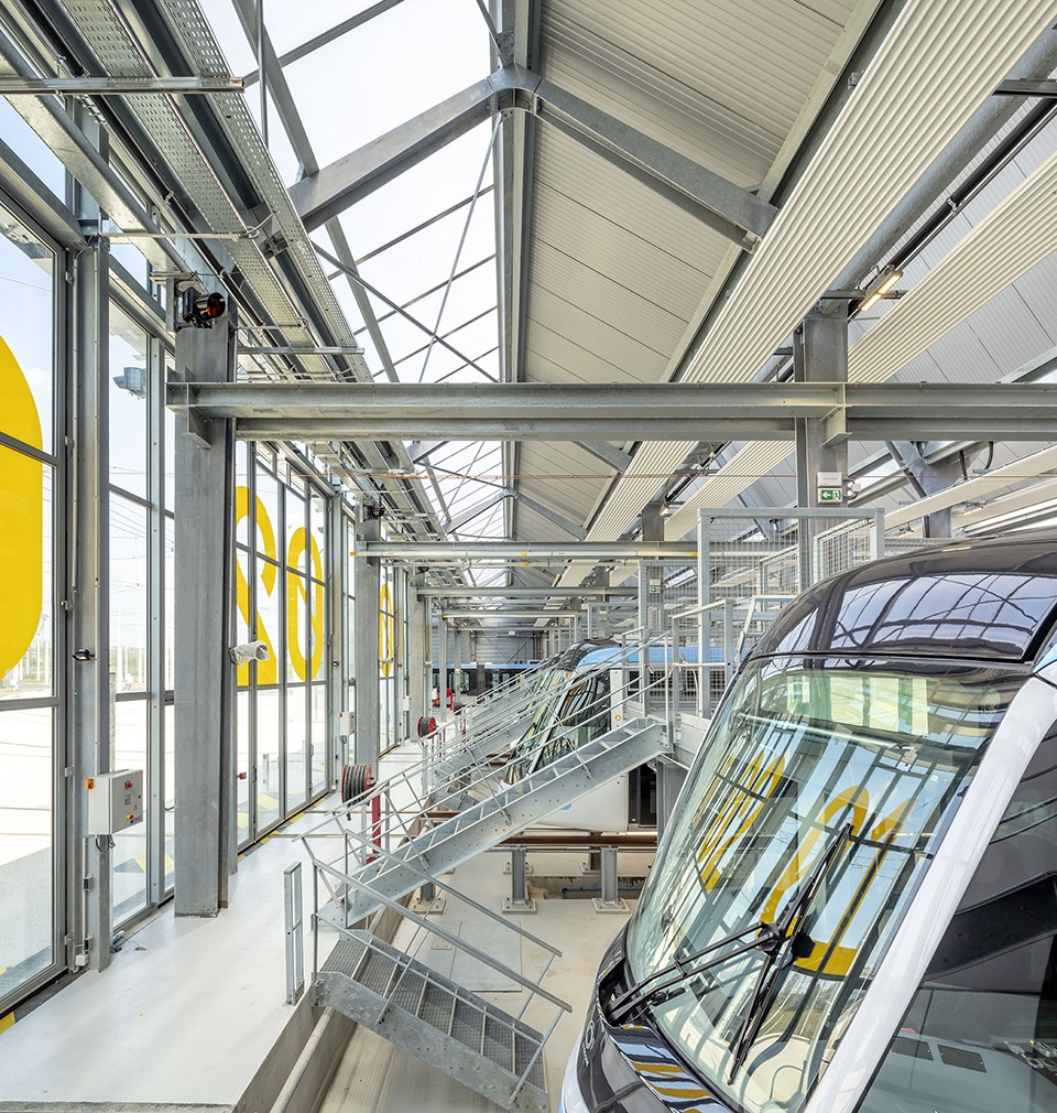 Three types of objects are juxtaposed here: first, of course, the tramway cars, with their impeccable technology, their beauty of mass-produced objects. Then there are the buildings, for which Ferrier Marchetti Studio was responsible for the design, and finally, the great platform streaked with rails and dotted with technical objects. The aim was for the site as a whole to offer a coherent overall landscape. The architectural style, in a search for affinity and resonance between the building and the technical equipment, uses very simple materials, implemented in their truth.