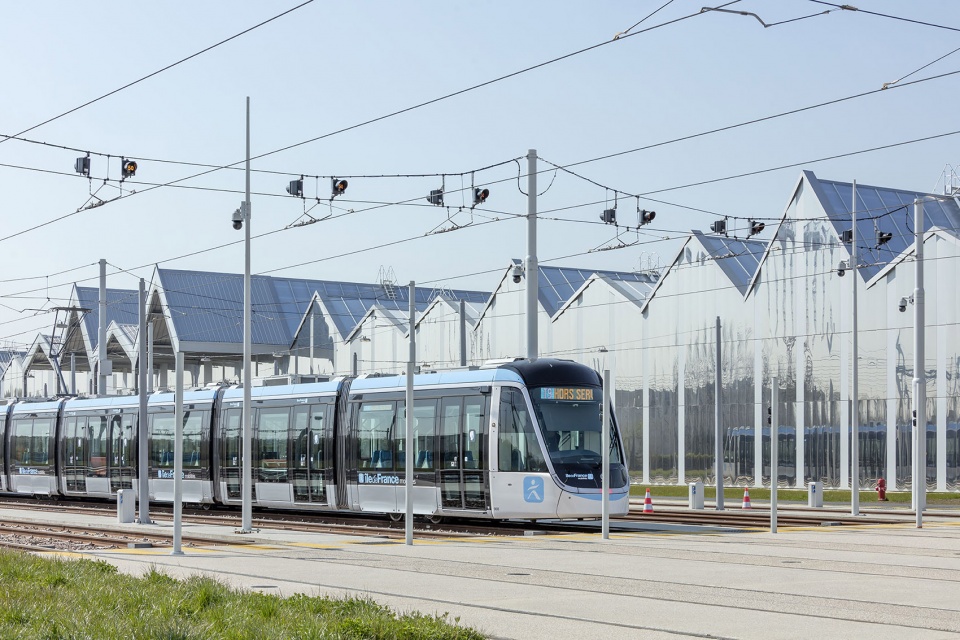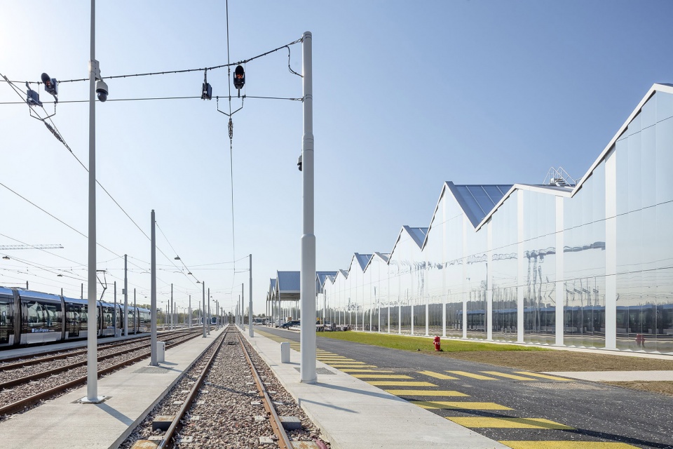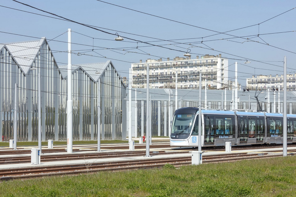 The setting in majesty of an industrial equipment in the suburbs of Paris. The concern for mixed use, which is much talked about at the moment, is not limited to mixing housing with offices and shops. We must also be able to find other workplaces in the city, including heavy equipment. In Orly, the T9 maintenance center, even at night, does not go unnoticed, especially when viewed from the train. Here we work late, and we start very early. There is a scenography of this activity, in the city, which is part of the urban spectacle of Greater Paris: a tramway will run every four to five minutes on this line, which will carry 70,000 to 80,000 passengers daily.
