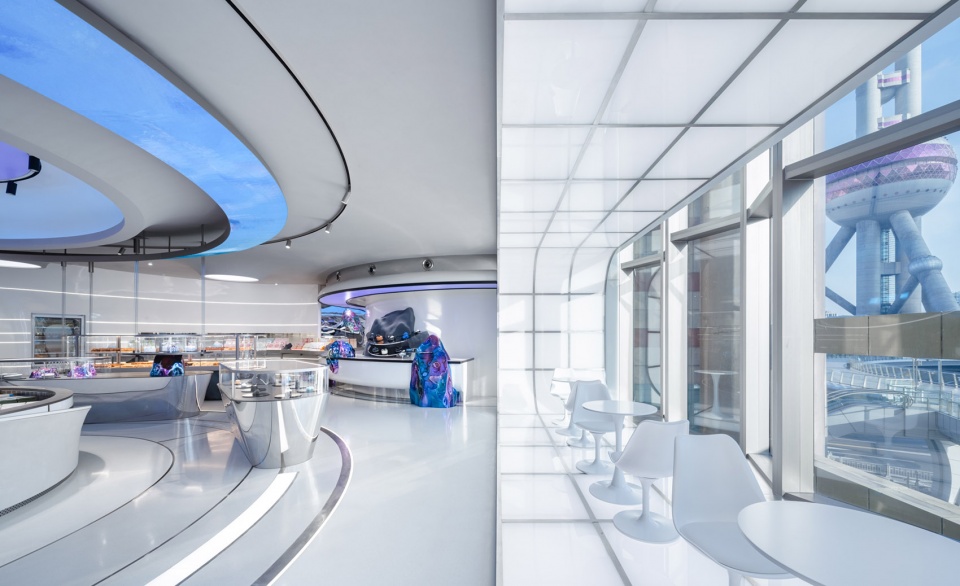 ▼时空飞行器中转站及周边展示台,The space-time craft and the nearby display table ©WenStudio