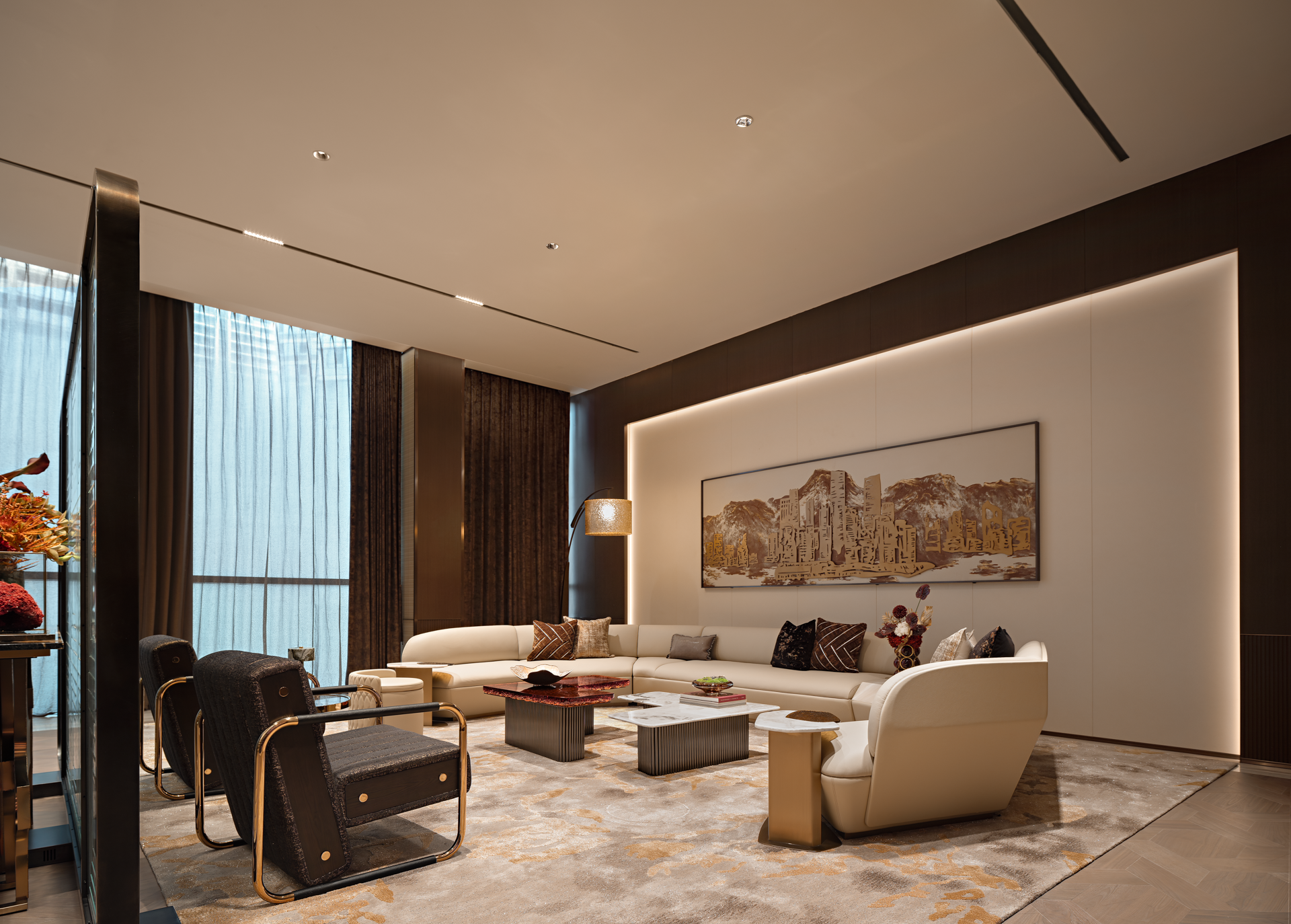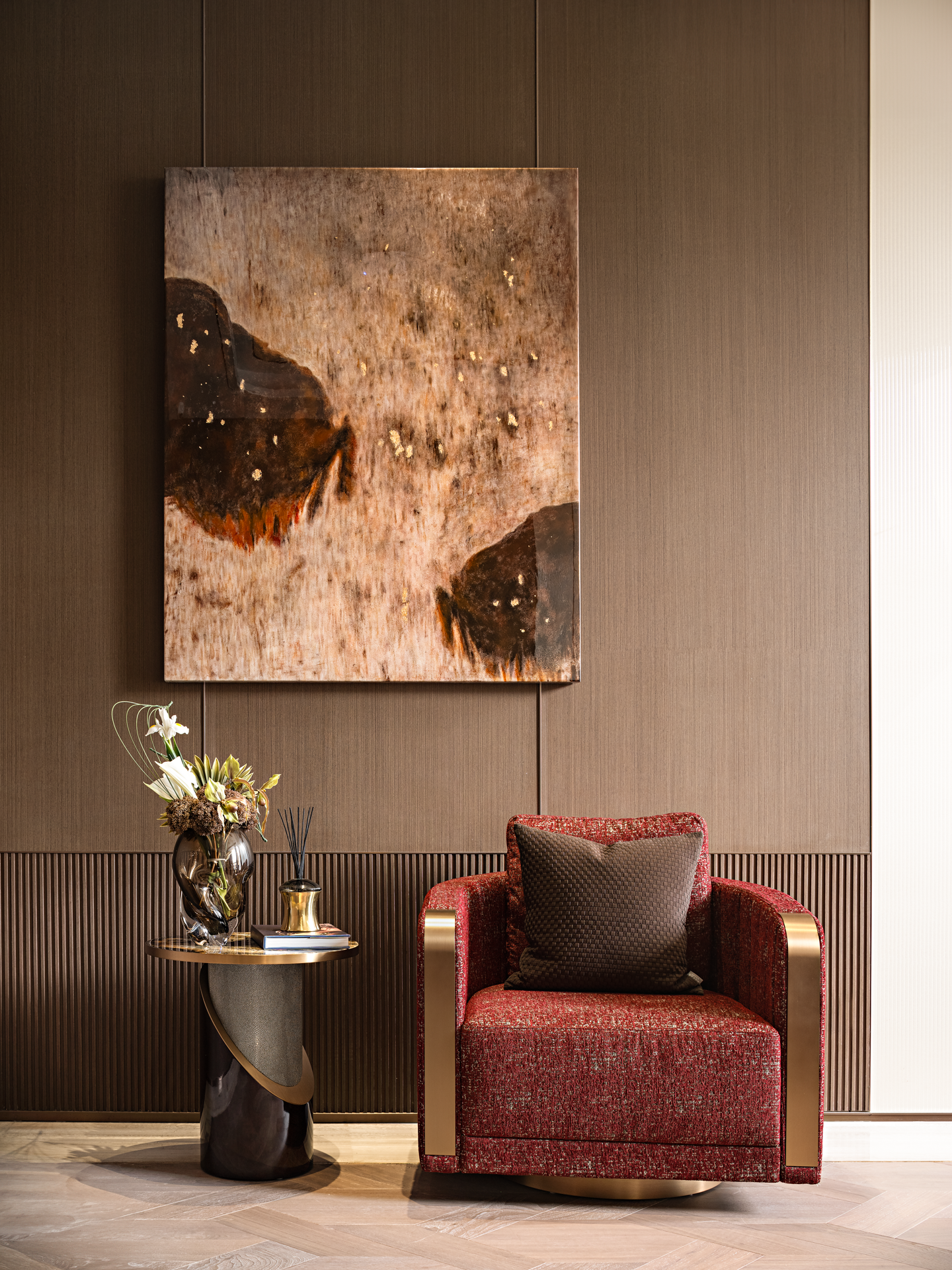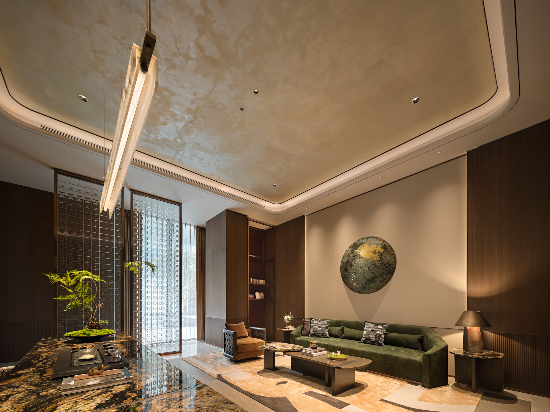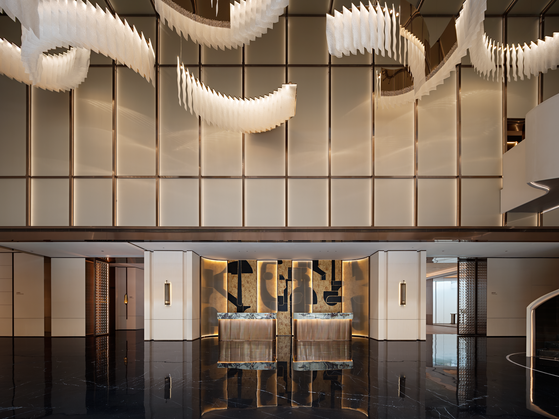 将山水图景植入空间,对自然意象进行融纳与升华,叠加、重组,抽象铺陈创造出不确定的视觉感,从光影的变幻到材质的触感,从线条的流畅到色彩的和谐,雕琢出层次波澜交织的静谧空间。细节低语,述说艺术与生活之韵。