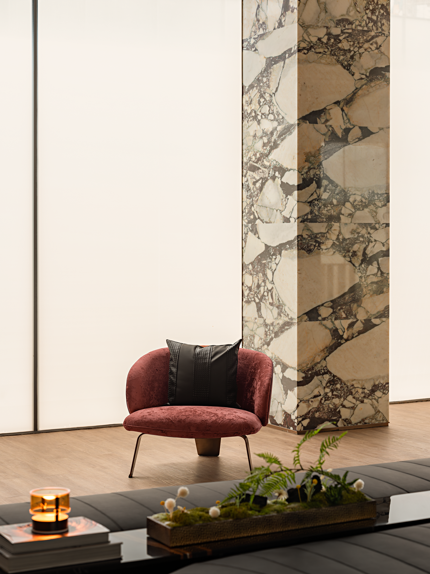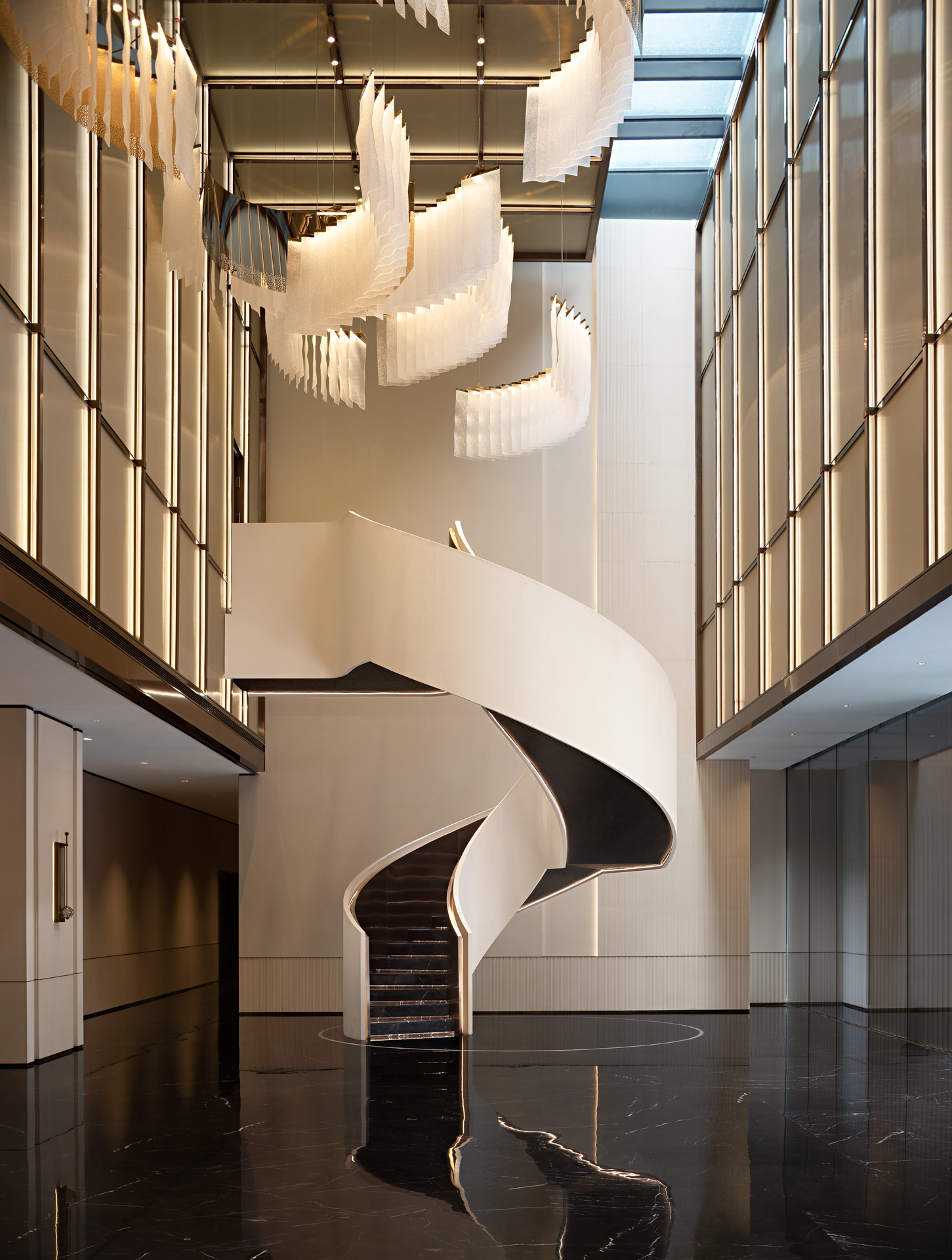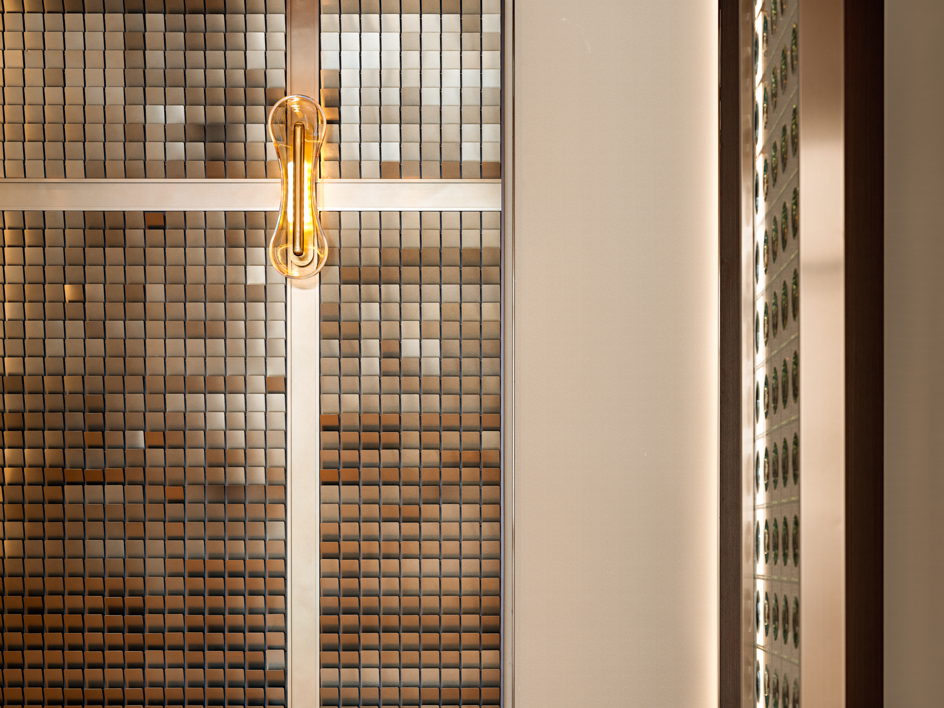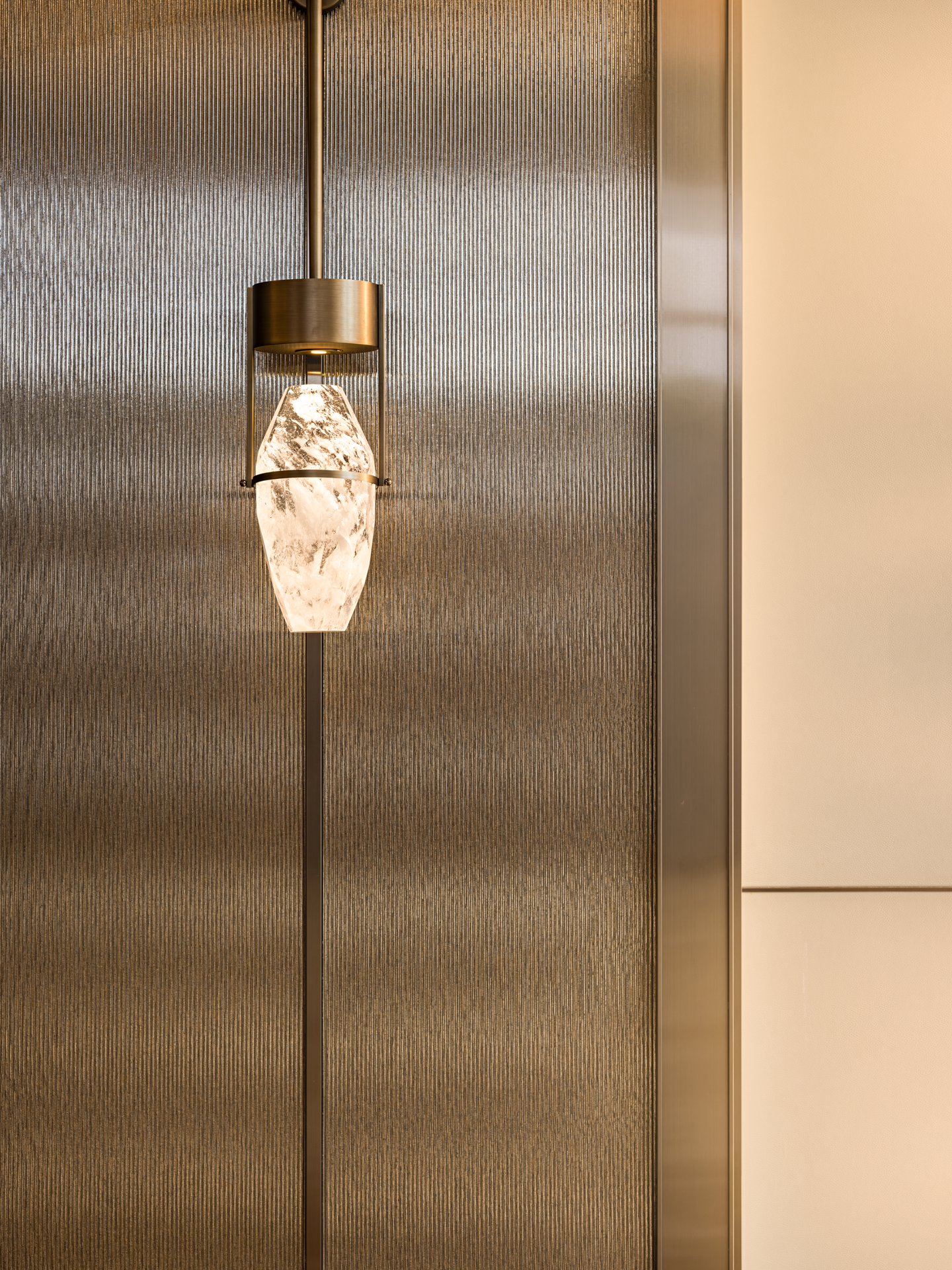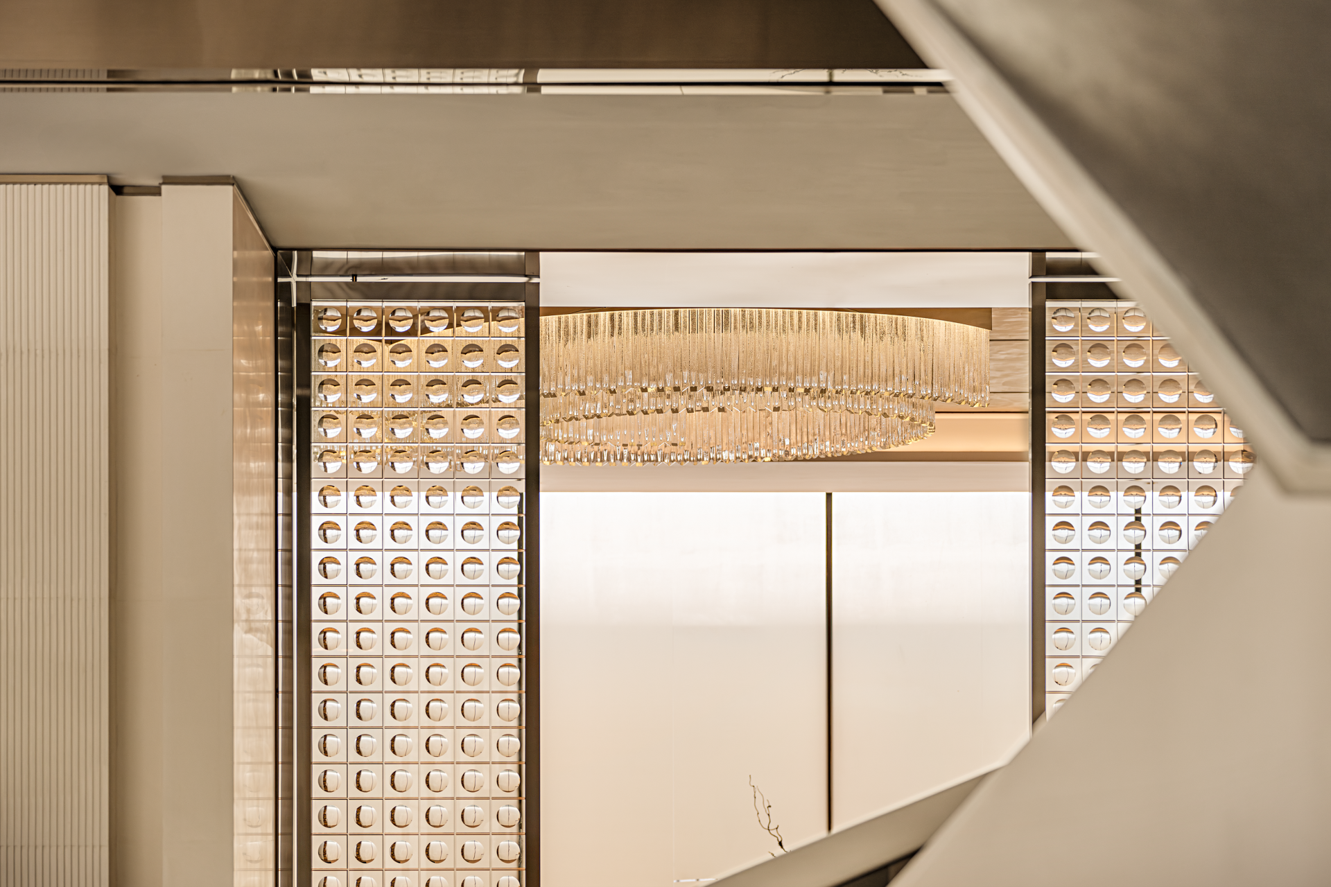 将山水图景植入空间,对自然意象进行融纳与升华,叠加、重组,抽象铺陈创造出不确定的视觉感,从光影的变幻到材质的触感,从线条的流畅到色彩的和谐,雕琢出层次波澜交织的静谧空间。细节低语,述说艺术与生活之韵。