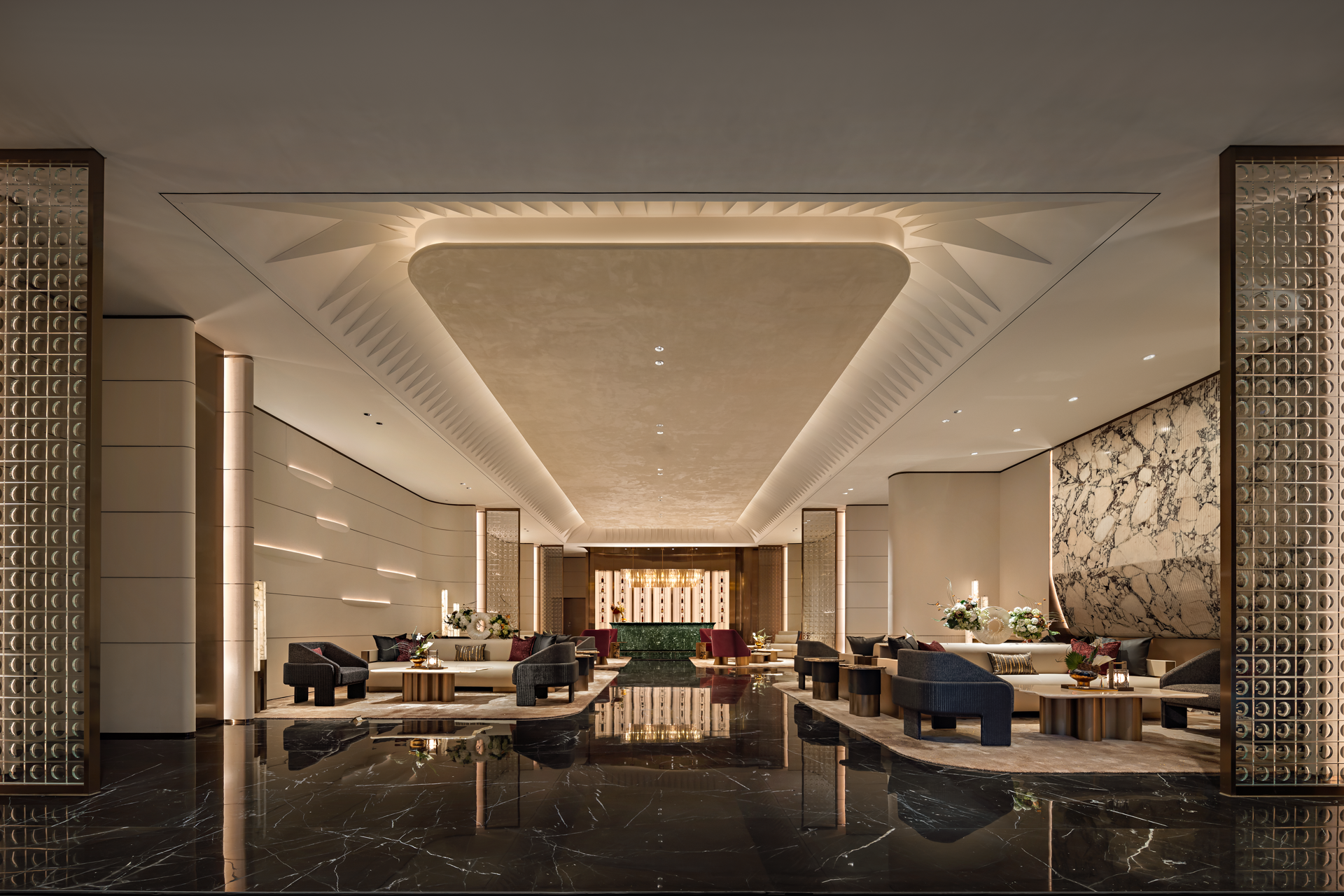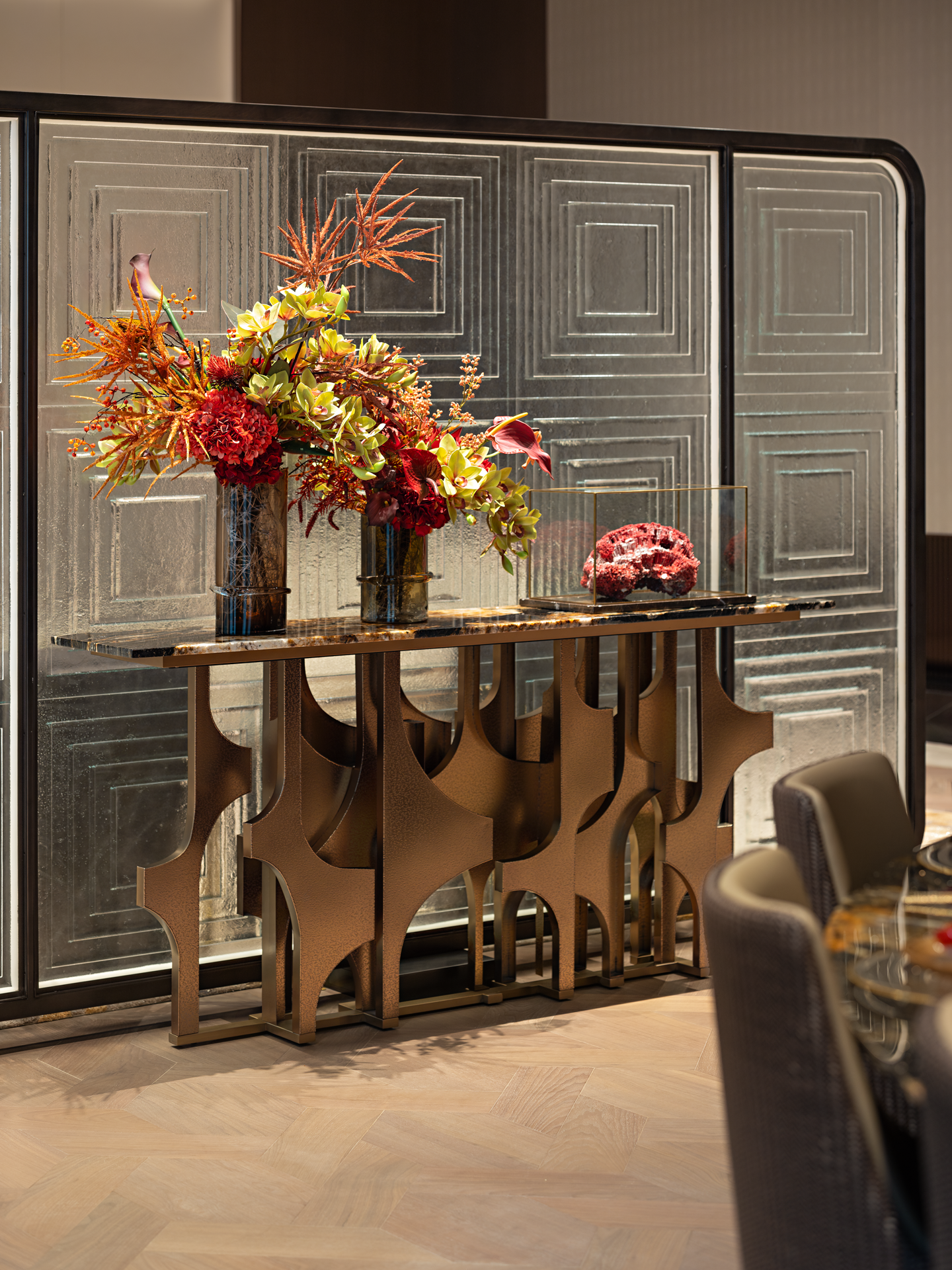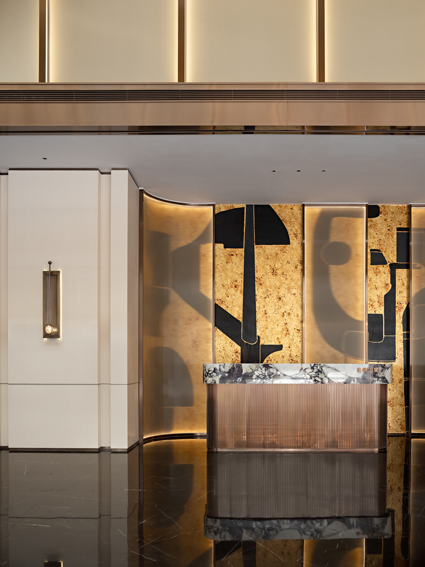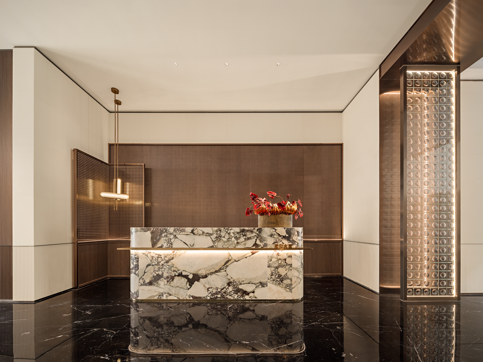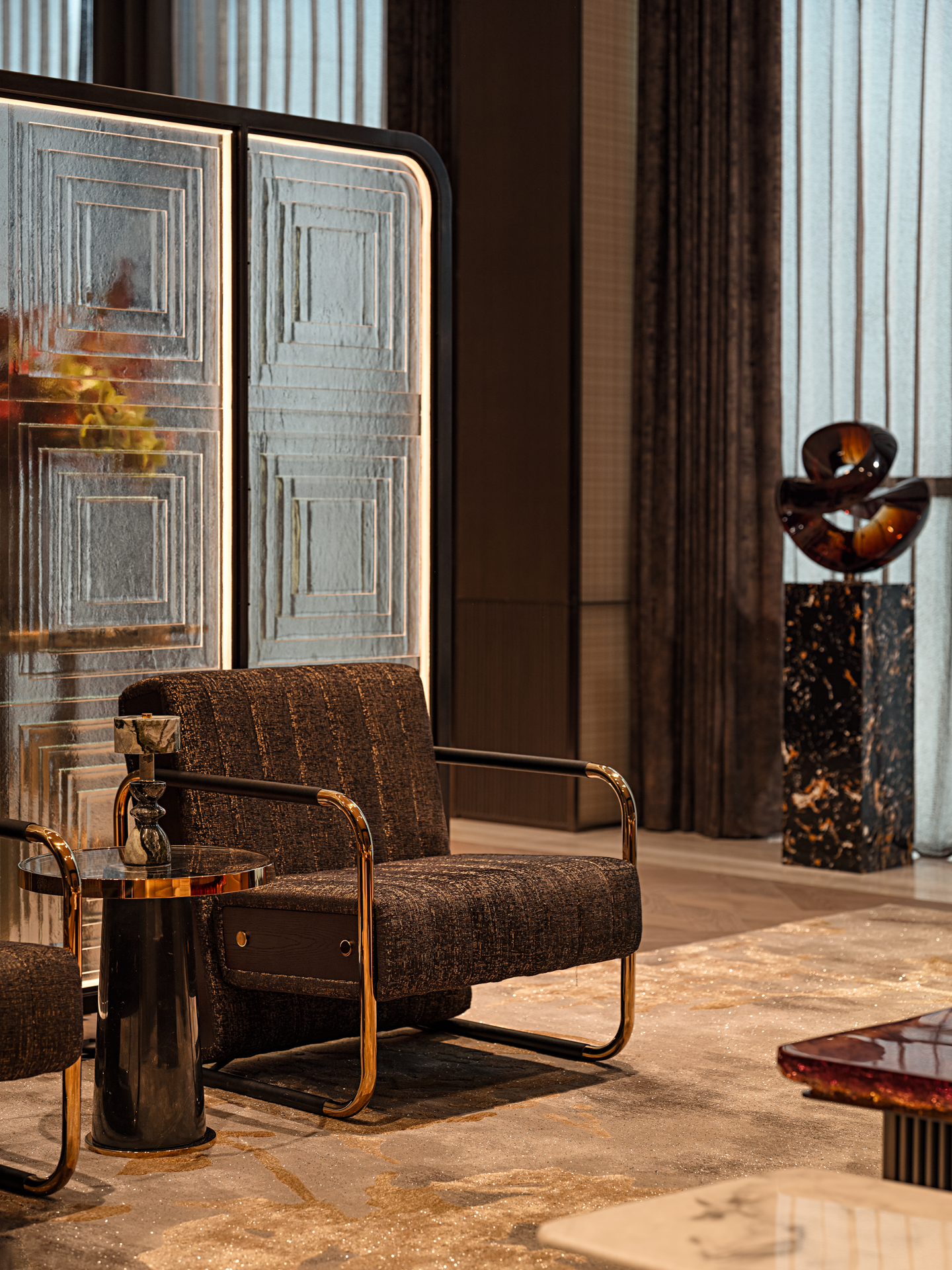 以珠江水流的蜿蜒形态为灵感,天然石材的纹理与古铜的质感交相辉映,共同营造出典雅而奢华的独特气质,感受水流的灵动与生机,为空间注入了深厚的文化内涵和独特的艺术魅力。