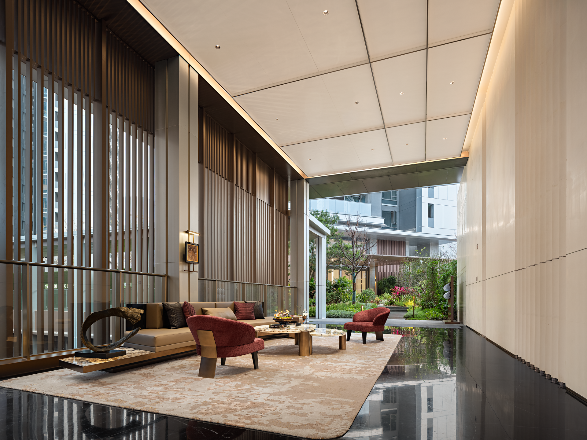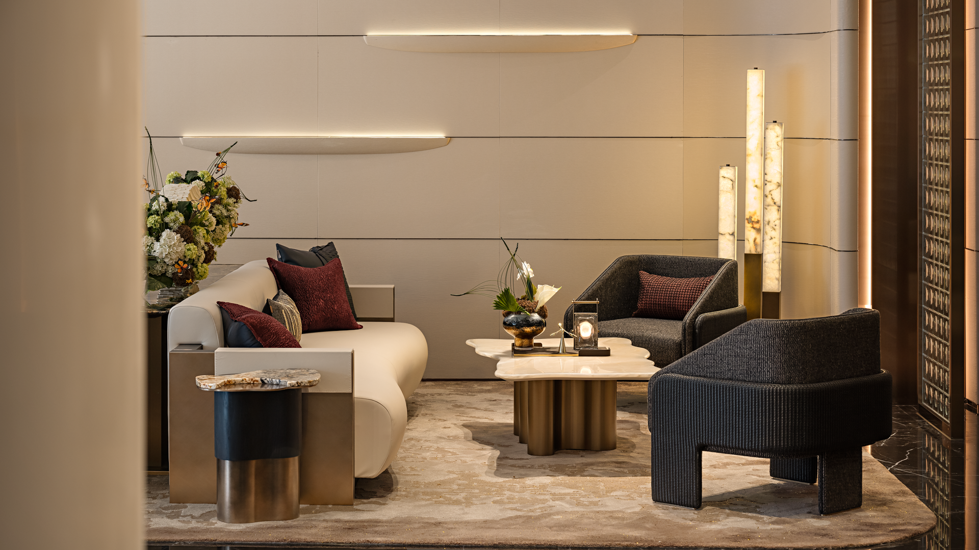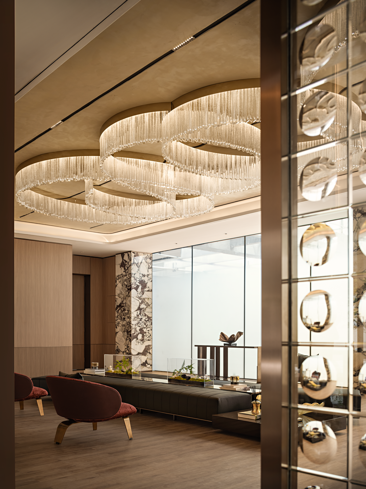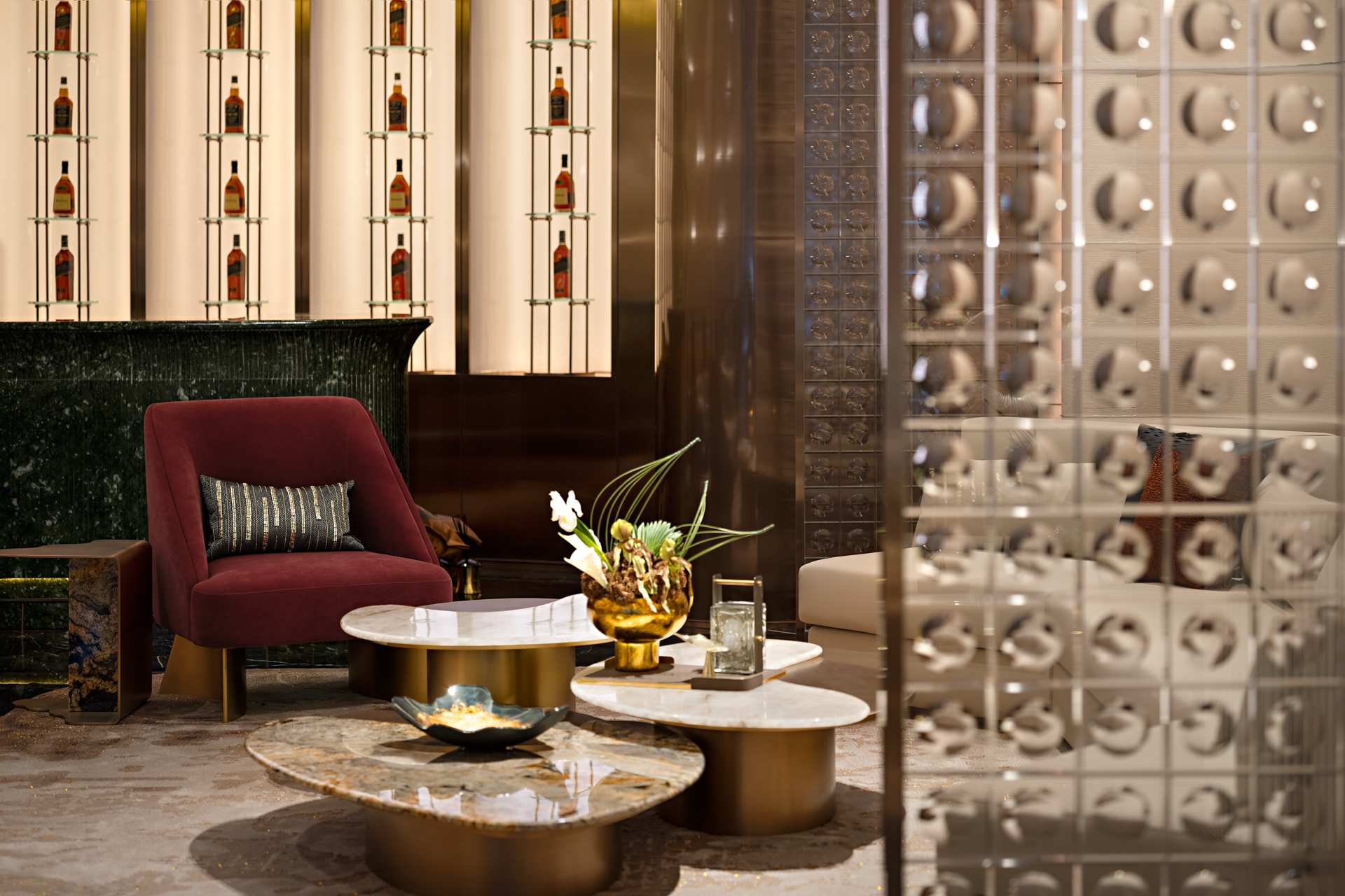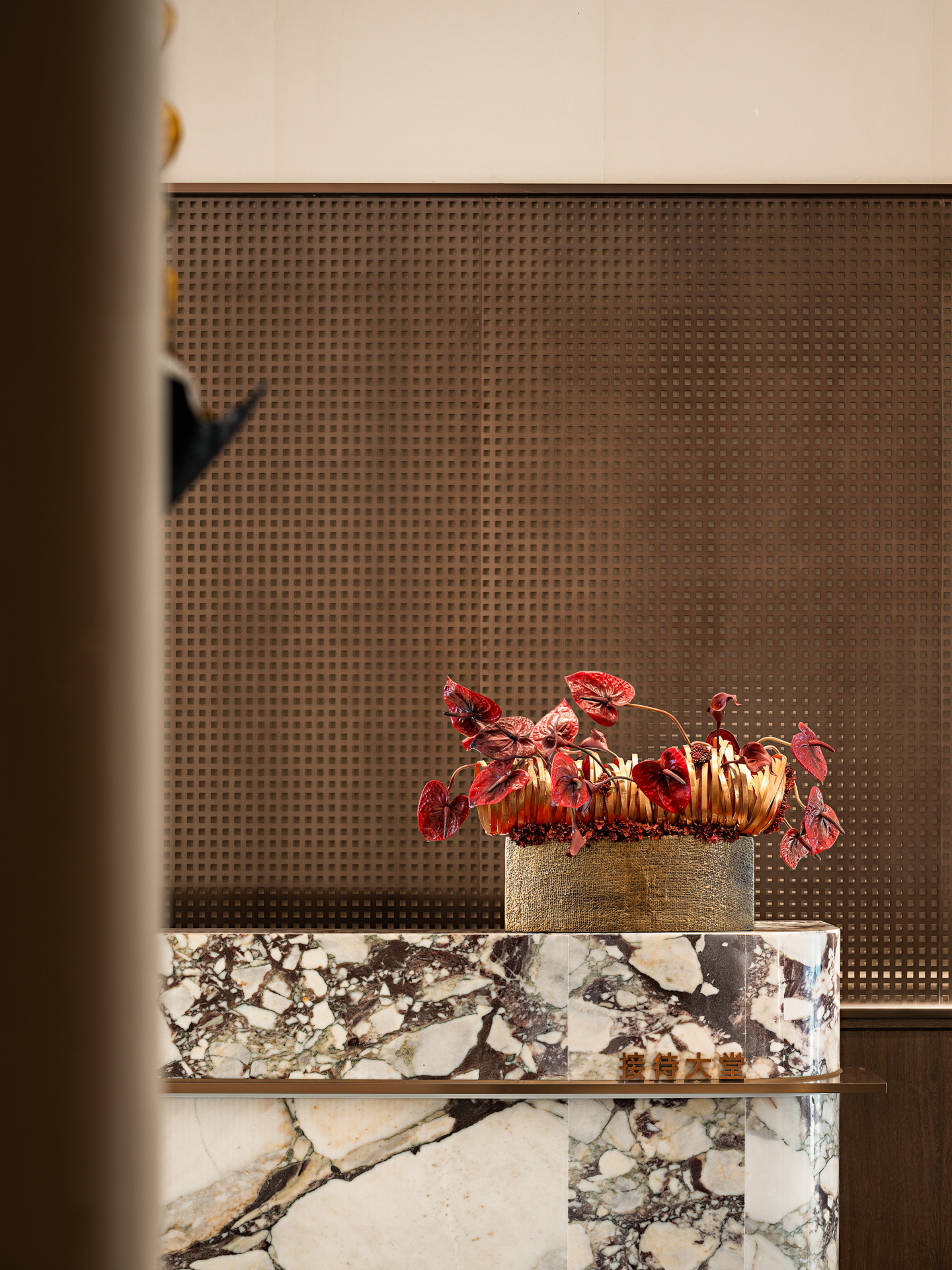 以珠江水流的蜿蜒形态为灵感,天然石材的纹理与古铜的质感交相辉映,共同营造出典雅而奢华的独特气质,感受水流的灵动与生机,为空间注入了深厚的文化内涵和独特的艺术魅力。