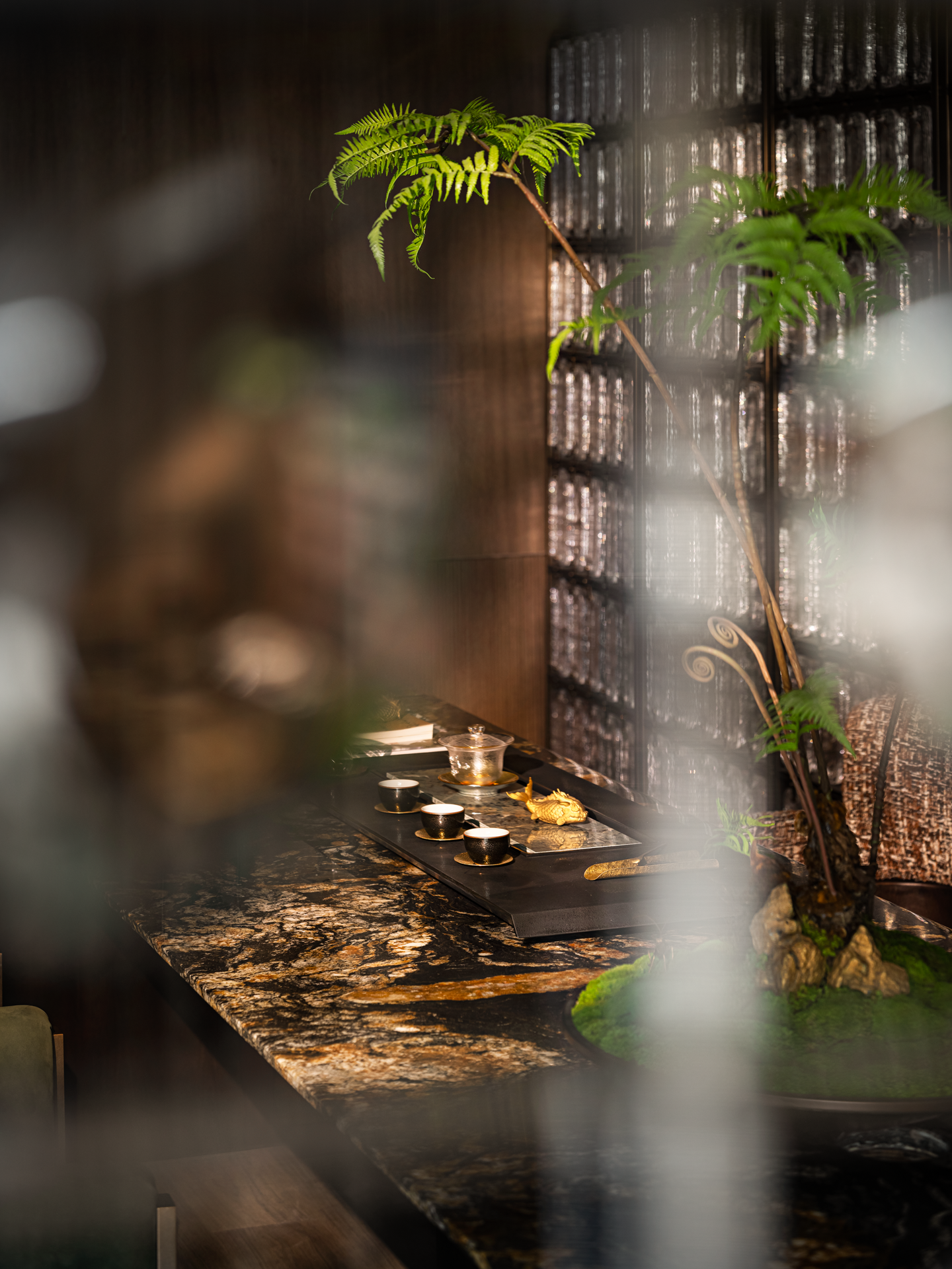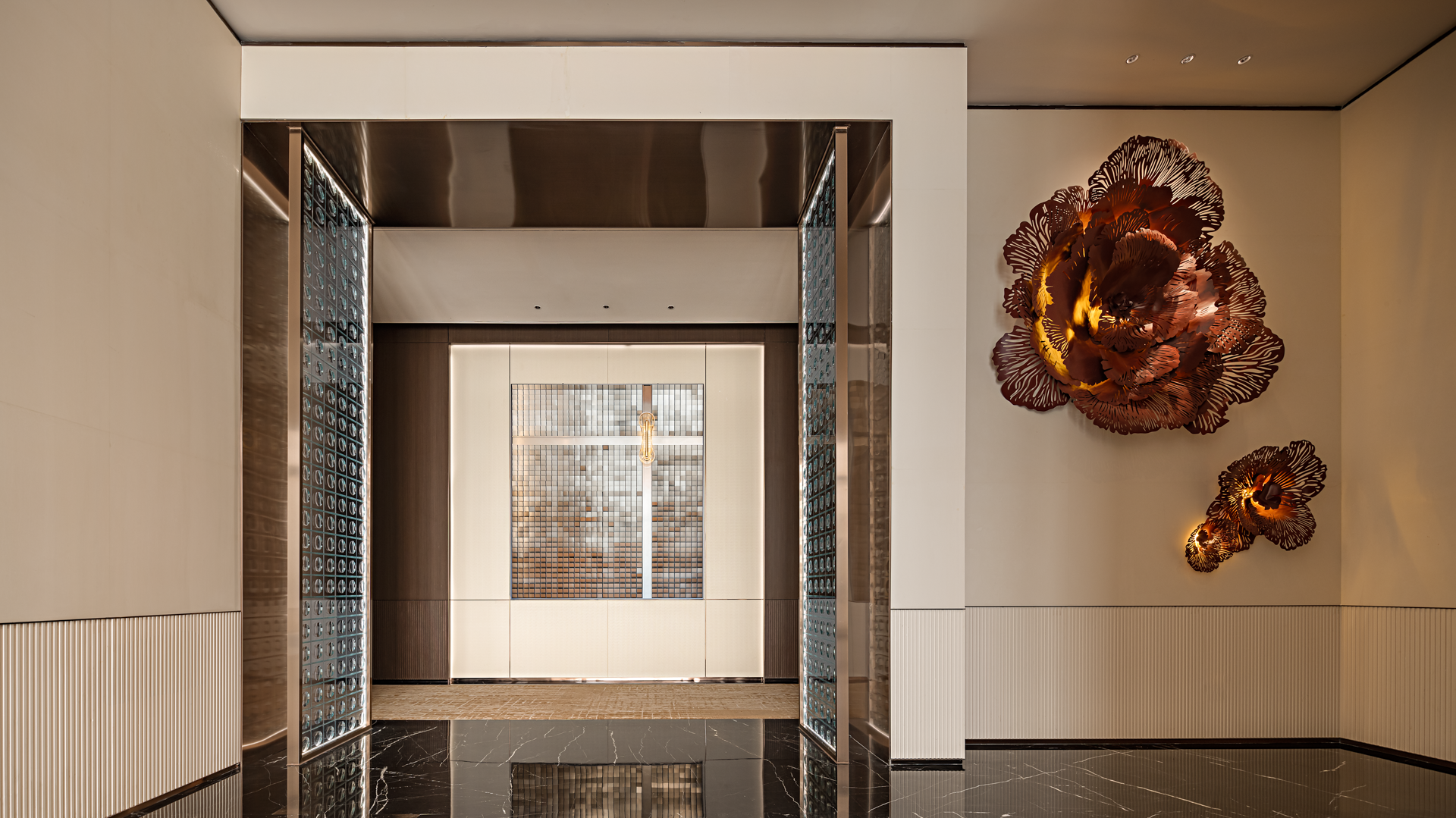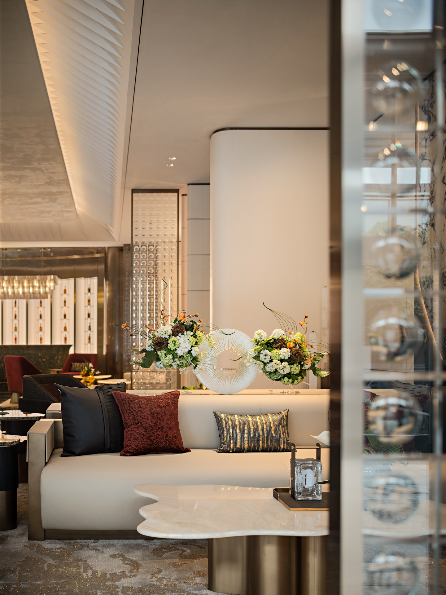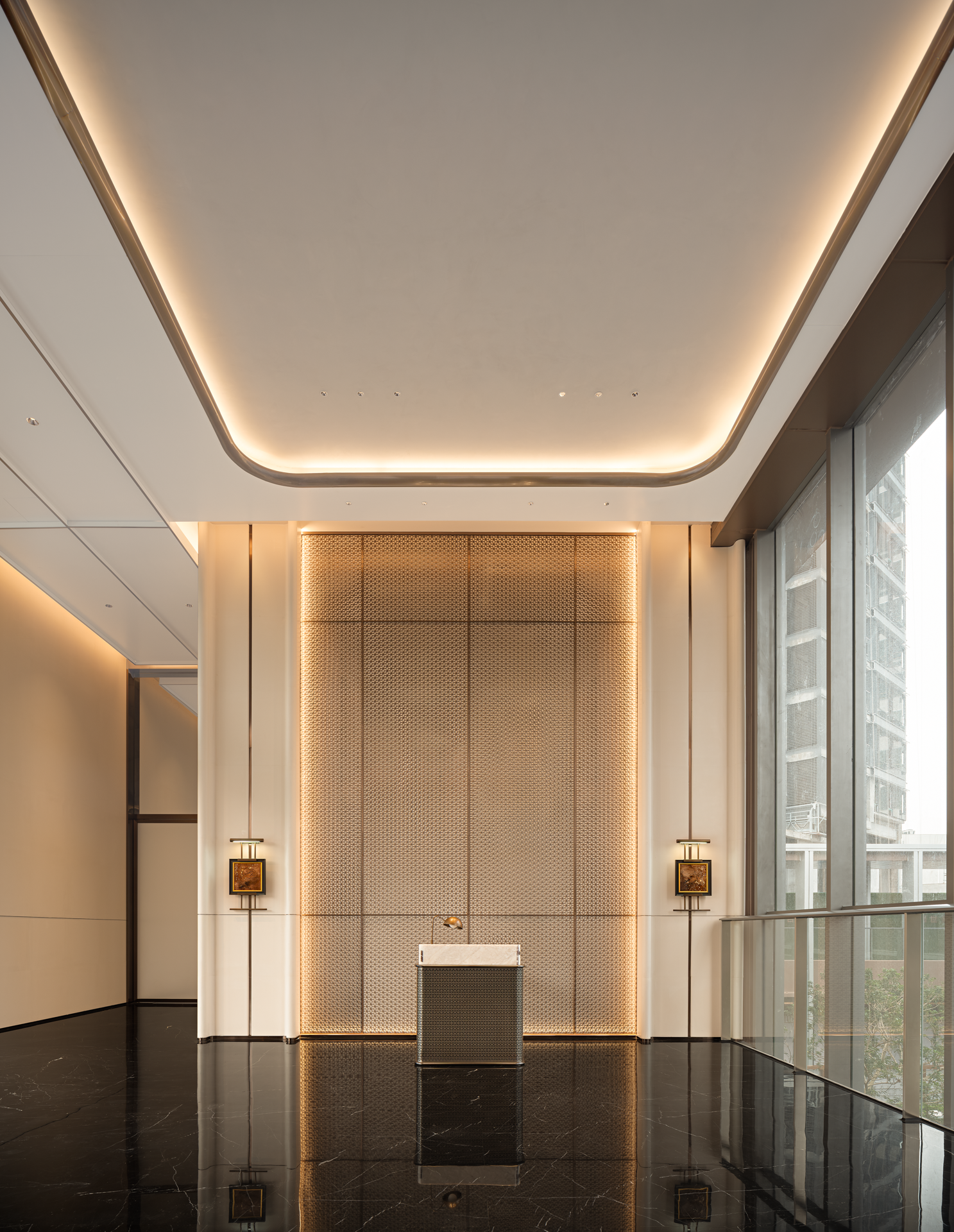 初进前厅豁然开朗,环绕式接待前厅以至高的接待礼仪,摩登与品质感并存的金属屏风,与“宝格丽奢石“接待台相得益彰开启并至如归的星级体验,当代人文与水墨朦胧的东方意境自成一派,空间虚实过度,从隐到显,低调而不失奢华,金属的肌理在光泽下流转,散发出细腻柔和的光泽,为整个空间增添了一抹现代而精緻的气息。