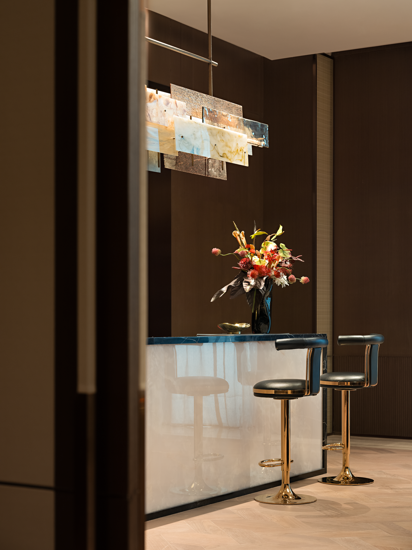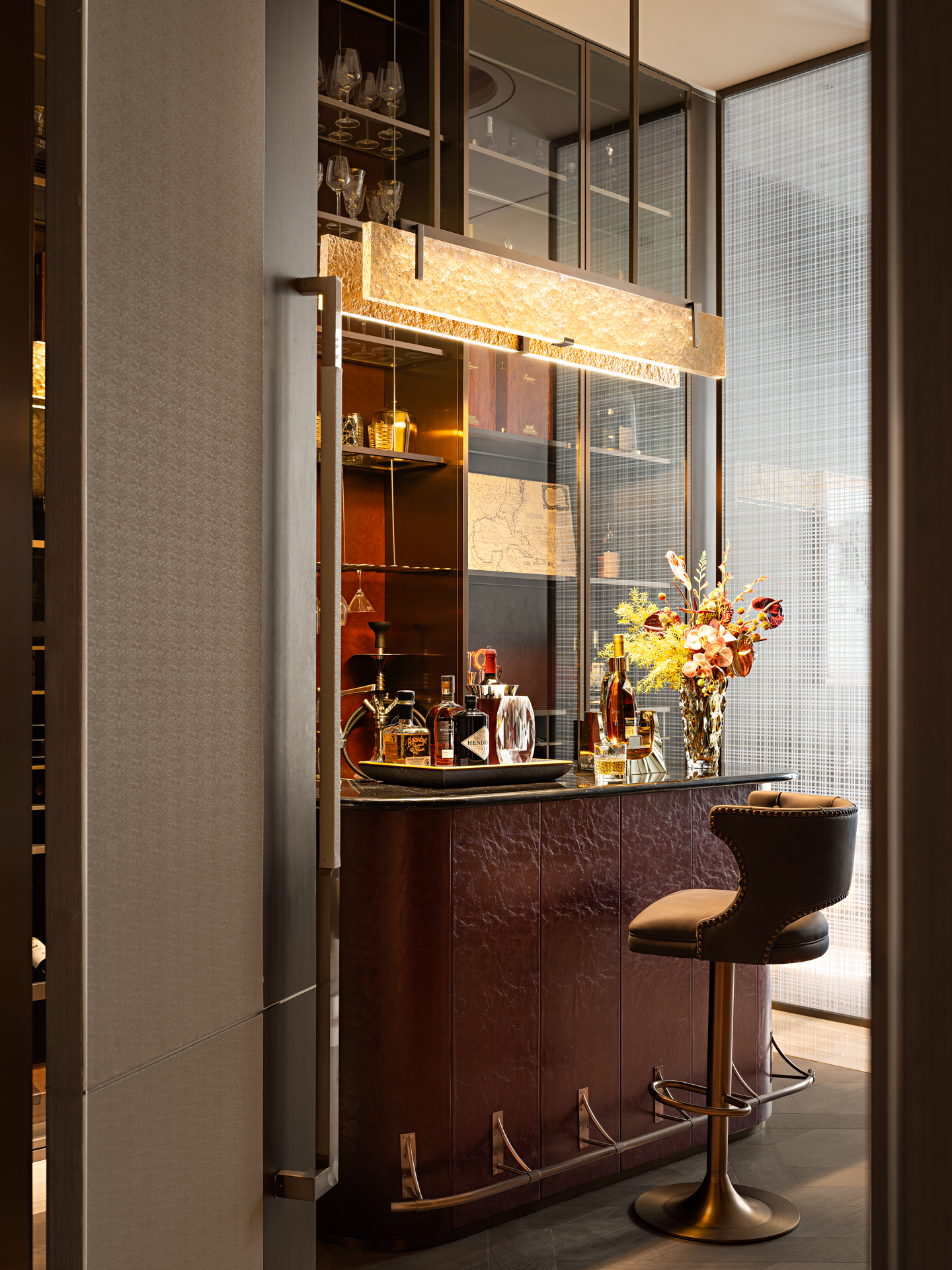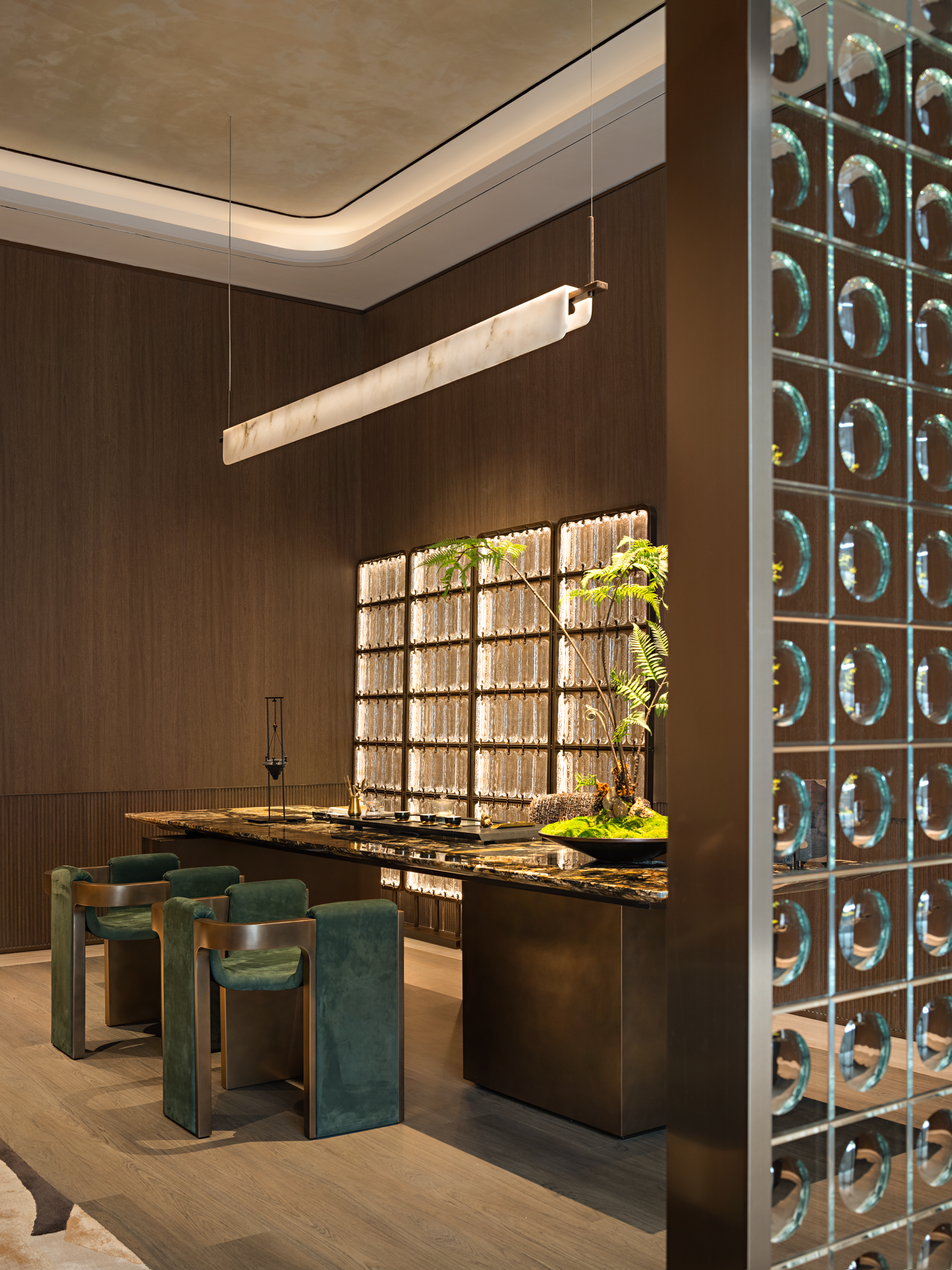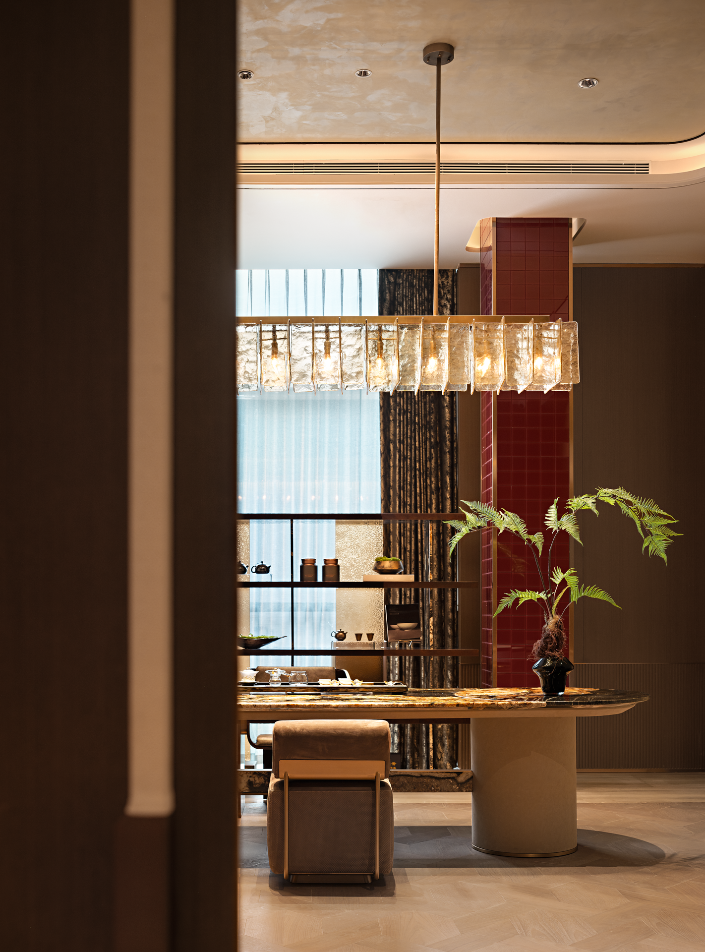 金属材质的细腻光泽在空间中轻盈舞动,反射出光线的灵动之美。而吊灯则来自捷克国宝级的水晶玻璃品牌LASVIT,以其精湛的工艺和独特的设计,为整个空间注入了无尽的魅力。从柔和的水晶灯光倾泻而下,到精緻朦胧的玻璃隔断若隐若现,每一处细节都彰显着优雅与高贵的气质,让人仿佛置身于一个精心打造的艺术空间。让人愿意放慢脚步,忘却尘世的喧嚣,与三五好友沉浸在这静谧与美好之中。
