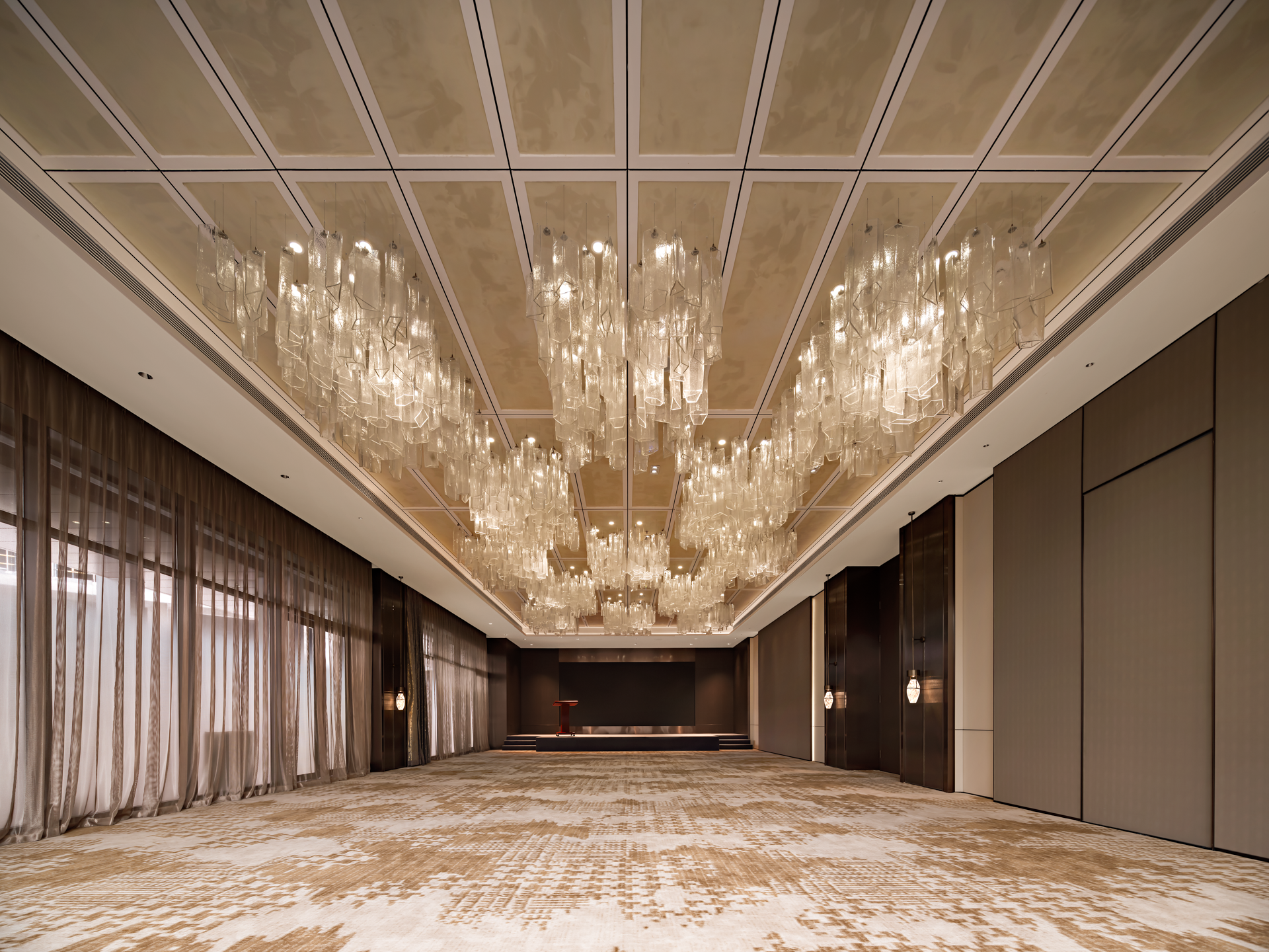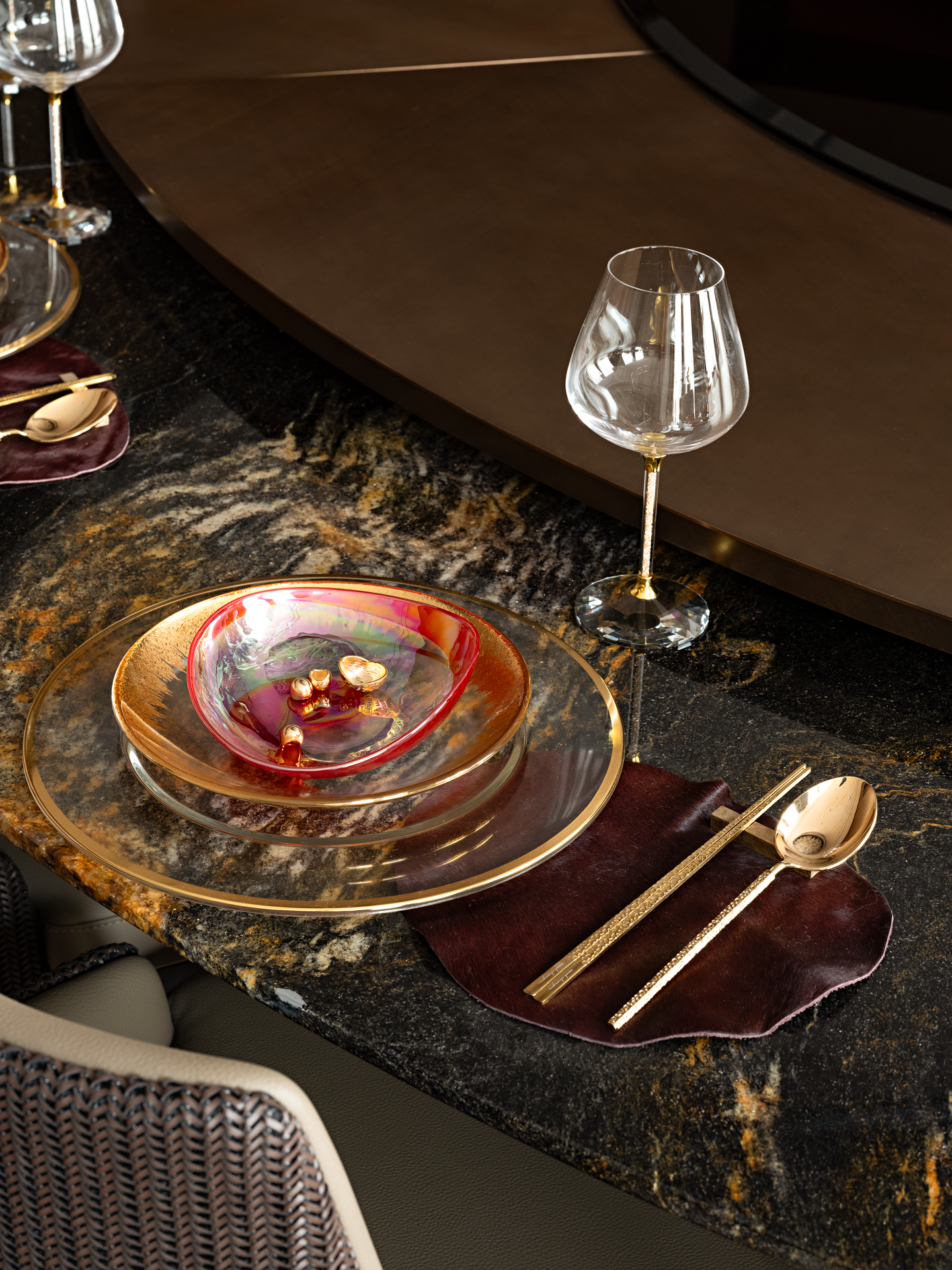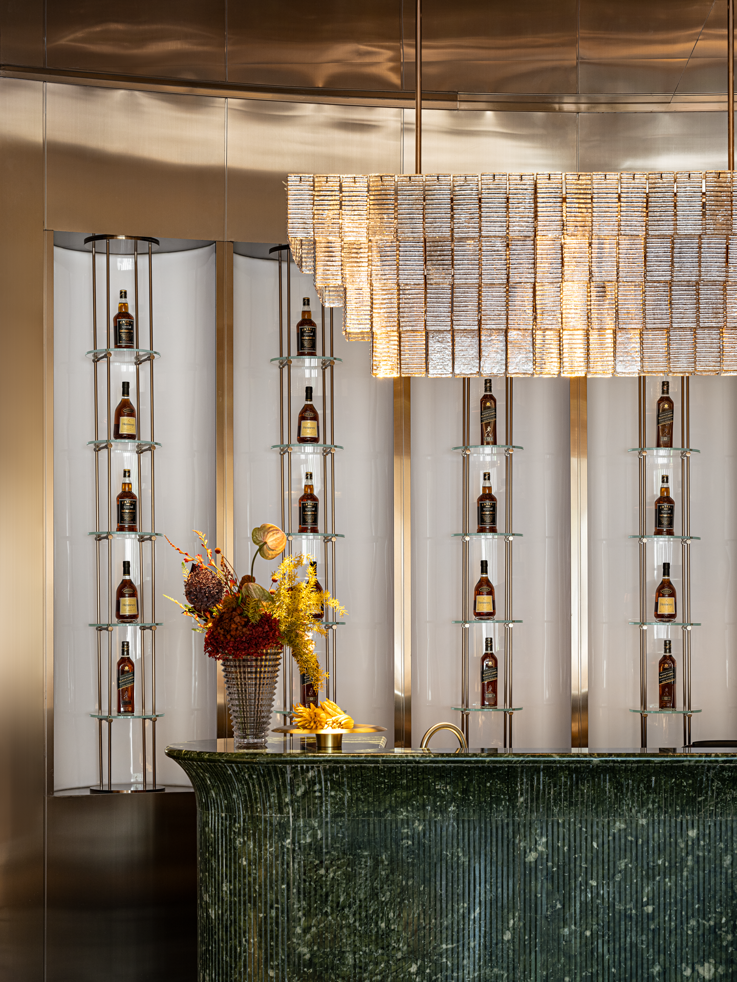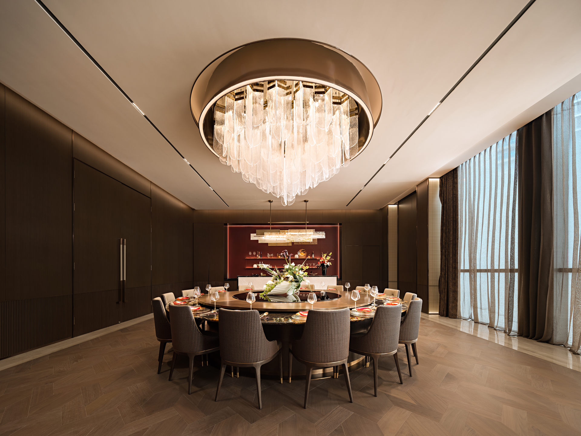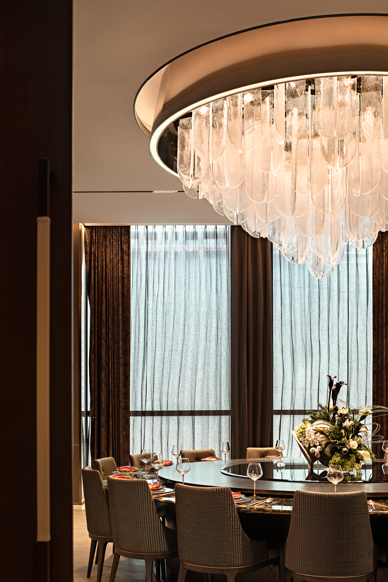 金属材质的细腻光泽在空间中轻盈舞动,反射出光线的灵动之美。而吊灯则来自捷克国宝级的水晶玻璃品牌LASVIT,以其精湛的工艺和独特的设计,为整个空间注入了无尽的魅力。从柔和的水晶灯光倾泻而下,到精緻朦胧的玻璃隔断若隐若现,每一处细节都彰显着优雅与高贵的气质,让人仿佛置身于一个精心打造的艺术空间。让人愿意放慢脚步,忘却尘世的喧嚣,与三五好友沉浸在这静谧与美好之中。