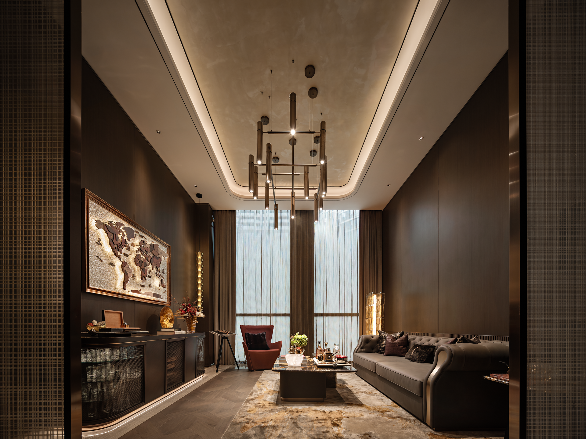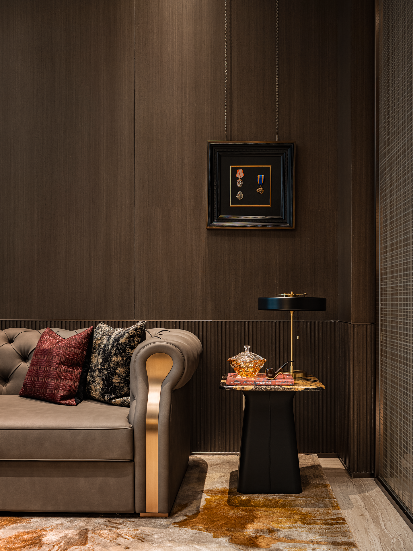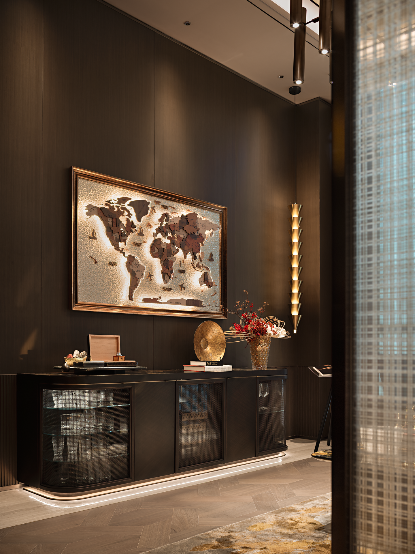 奢华且神秘的空间基调,暗藏着文人雅士閒聚的痕迹,书籍与摆件、雕塑等艺术品融合摆放,呈现出包容开放的生命状态。天时地利人和营造的静谧体验,与极具华丽代表的LALIQU以抽象线条与光线律动,为空间增添了一抹独特的艺术风采。