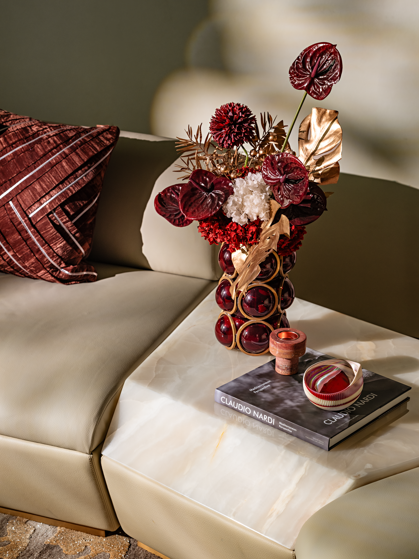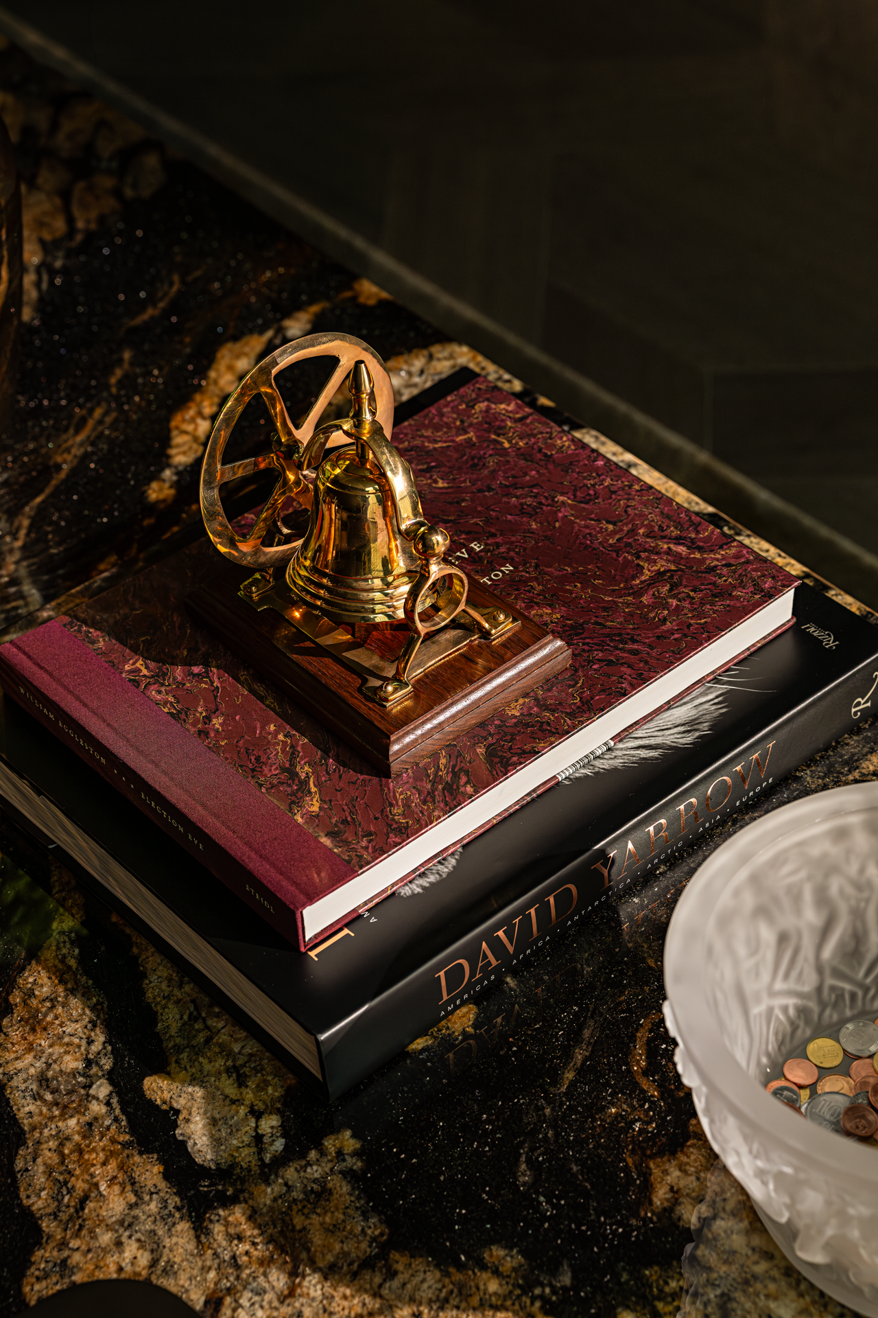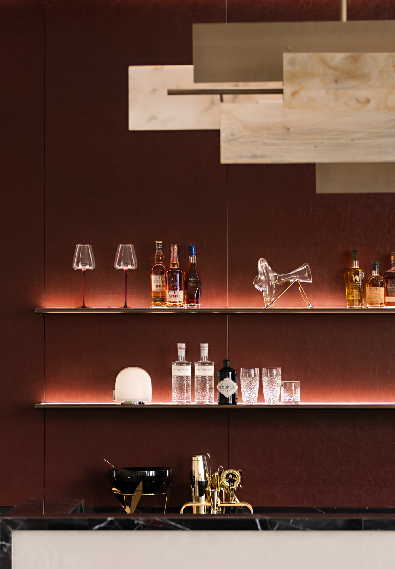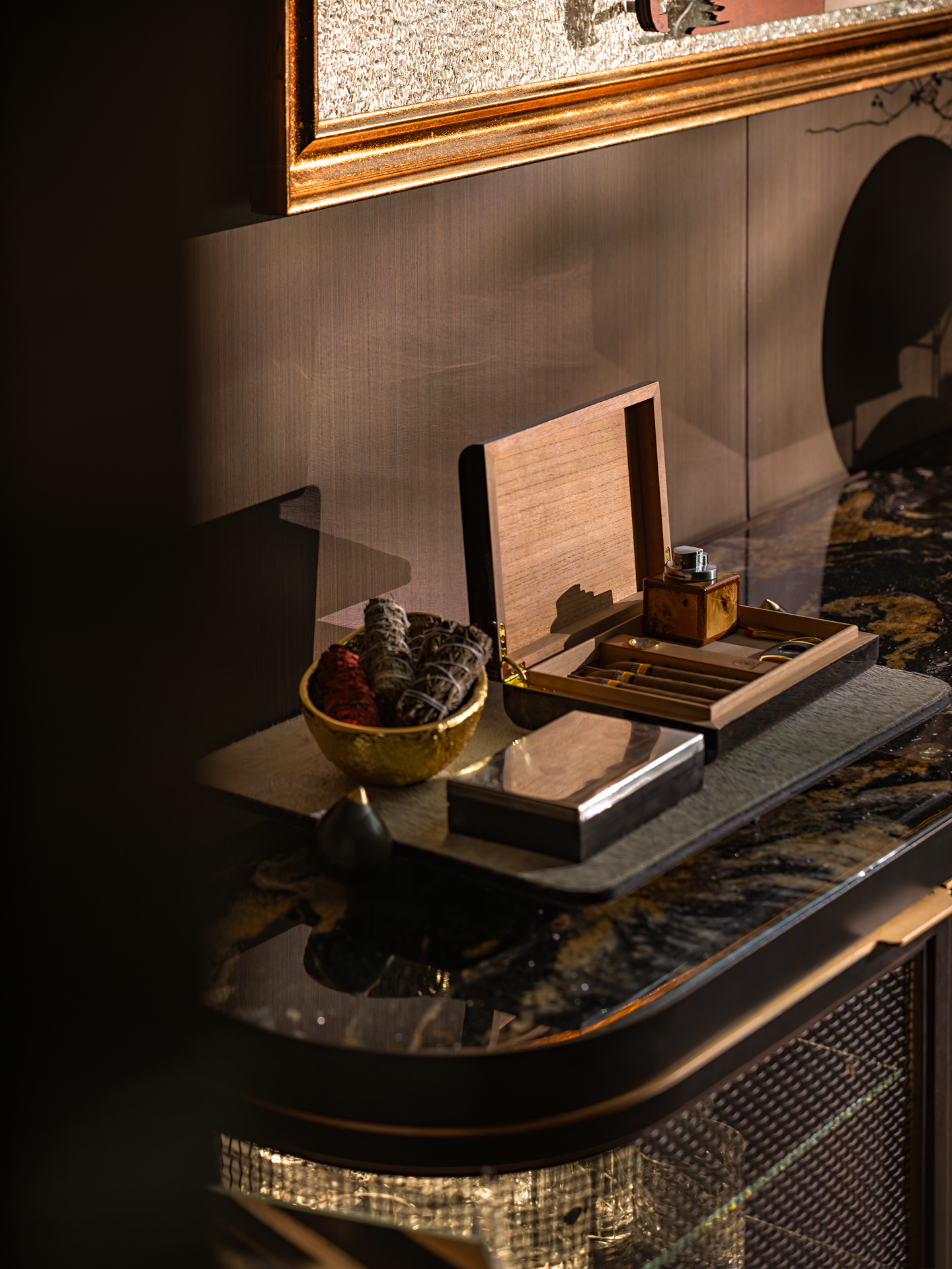奢华且神秘的空间基调,暗藏着文人雅士閒聚的痕迹,书籍与摆件、雕塑等艺术品融合摆放,呈现出包容开放的生命状态。天时地利人和营造的静谧体验,与极具华丽代表的LALIQU以抽象线条与光线律动,为空间增添了一抹独特的艺术风采。