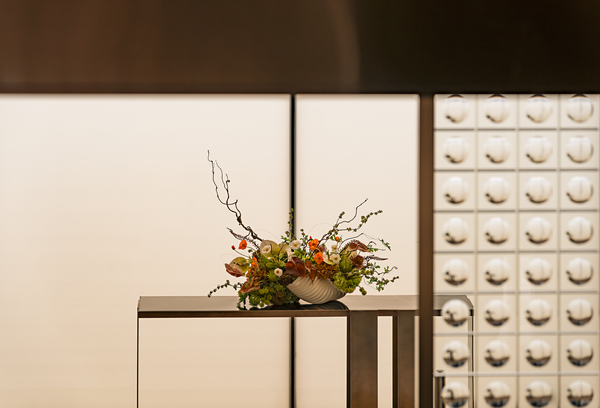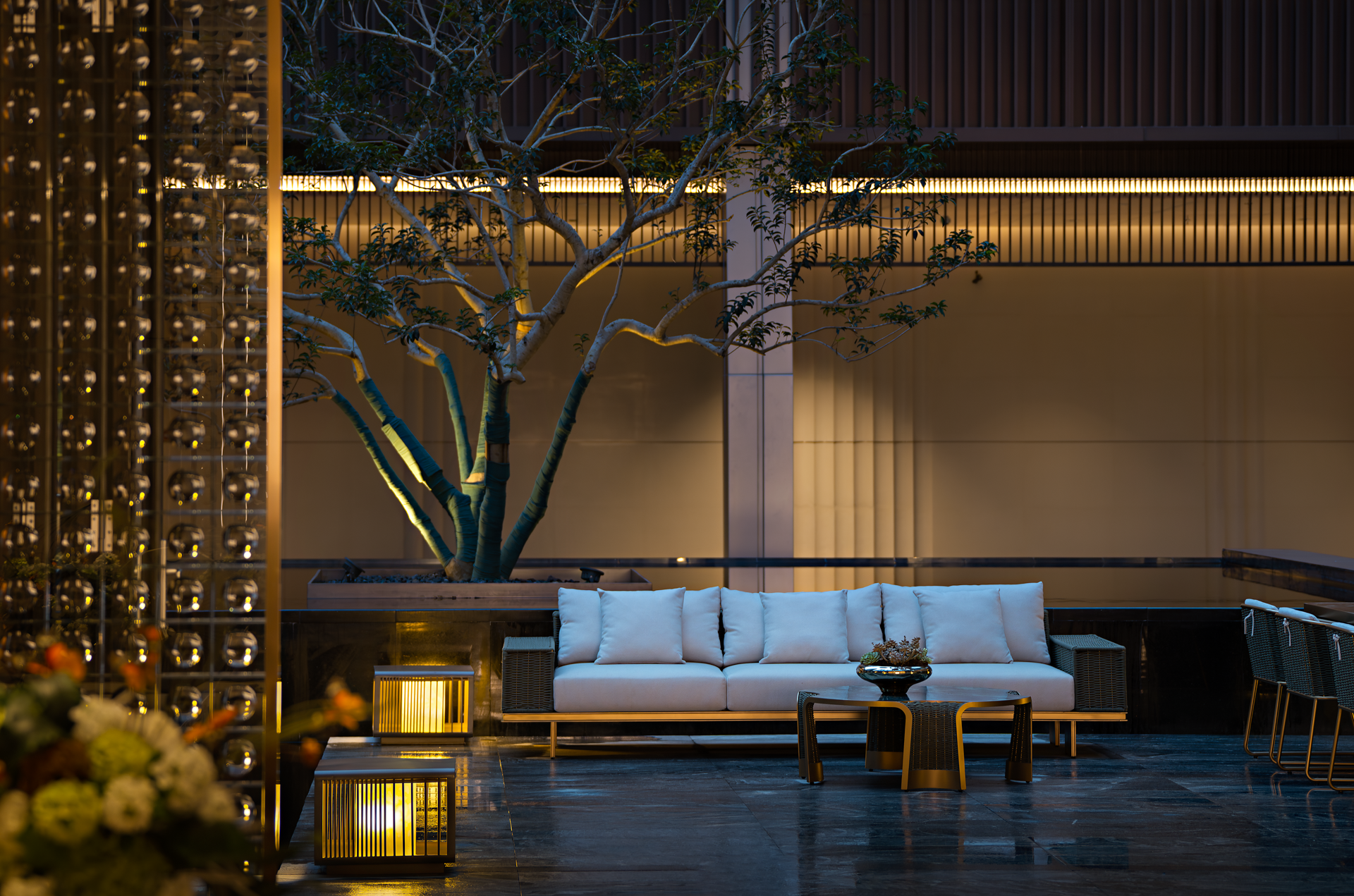 阵列的秩序性巧妙提升了空间的仪式感,两侧的艺术挂画点缀其间,既巧妙地平衡了空间的厚重感,又巧妙地融入了几分艺术气息。这种静谧的氛围,不仅是情感与内涵的交织,更如春日江面的和风,柔和而充满力量,任人沉浸在这份宁静与美好之中,探寻内心的平静与力量。