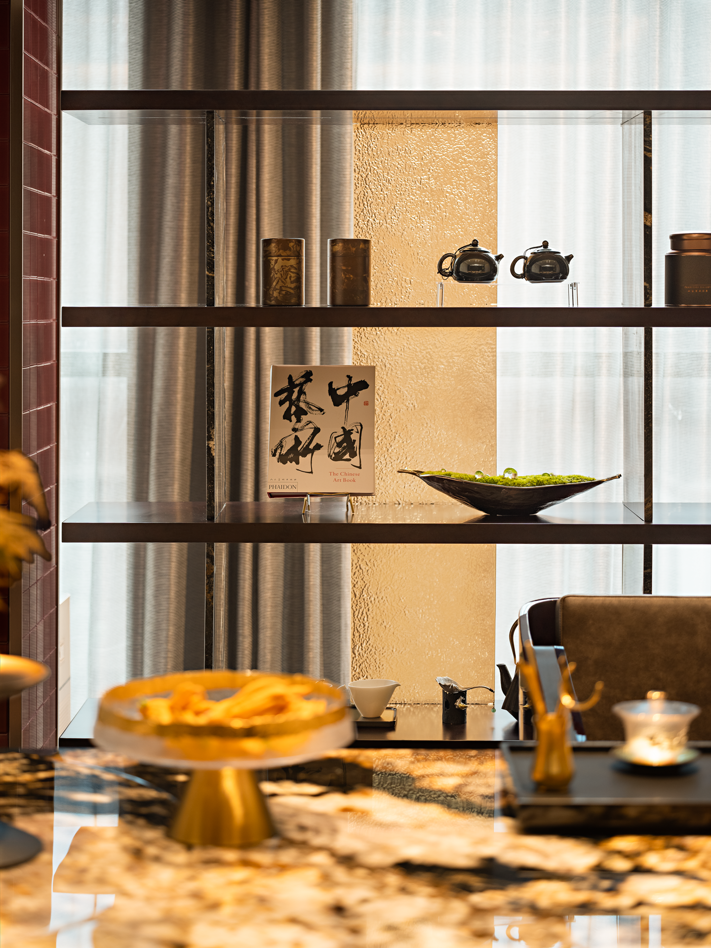 沉稳内敛的造境色调与精心挑选的陈列品相互碰撞,不仅展现了东方人文的深厚底蕴和历史演变,同时也体现了现代品质生活的追求与呈现。光与影的共存相生更是增添了几分神秘与诗意。精緻的陈列架摆放着各种艺术品和装饰品,或古朴典雅,或现代简约,但都散发着独特的魅力。