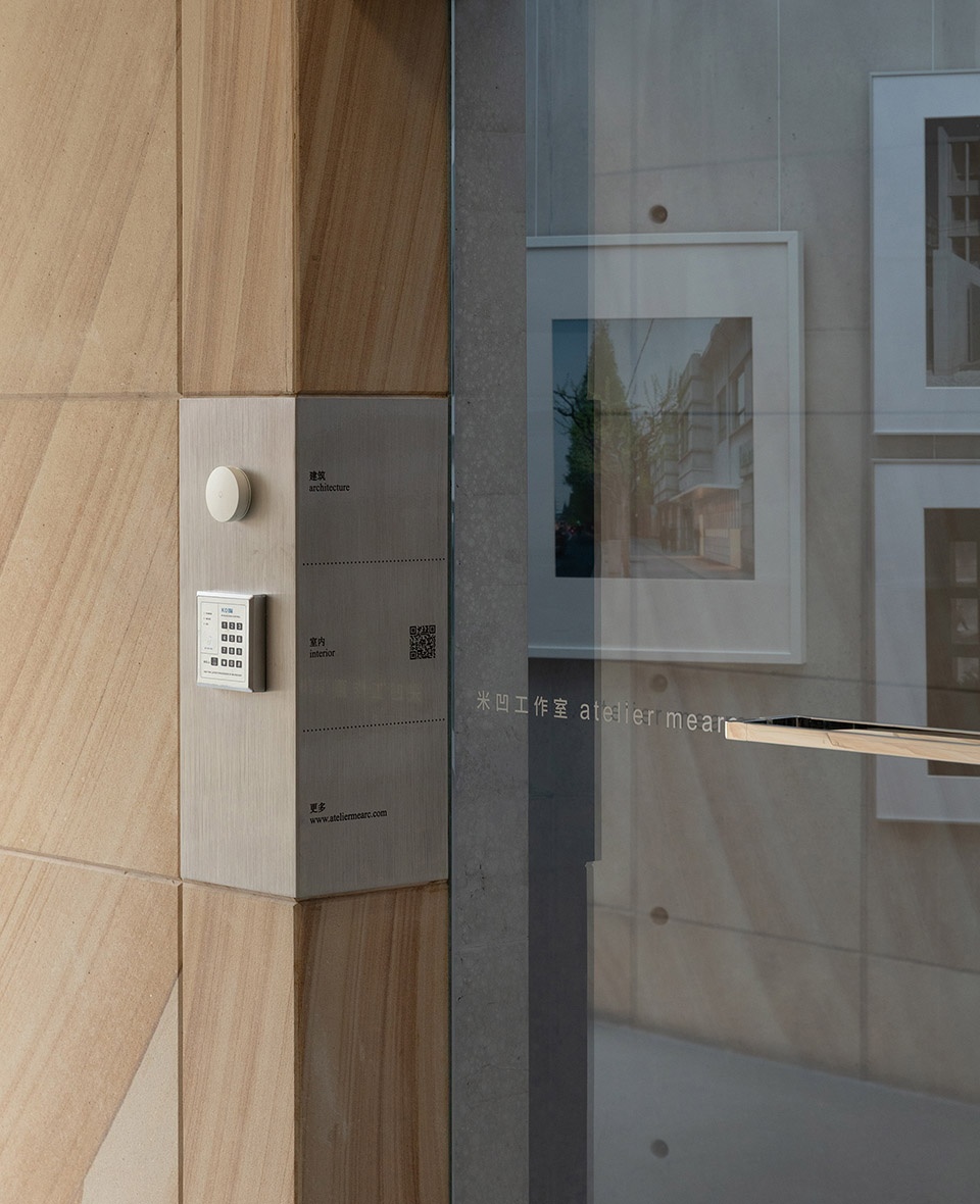 在工作室门口首先见到的是现浇混凝土的前厅。这里用展览的形式布置了一个“非接触”橱窗,透过玻璃大门,路过的人可以进行快速浏览,留下对米凹的初步印象,有兴趣的话还可以扫描门边的二维码做进一步了解。这处前厅以退让的姿态与活动在大厦内的人们建立起对话关系。