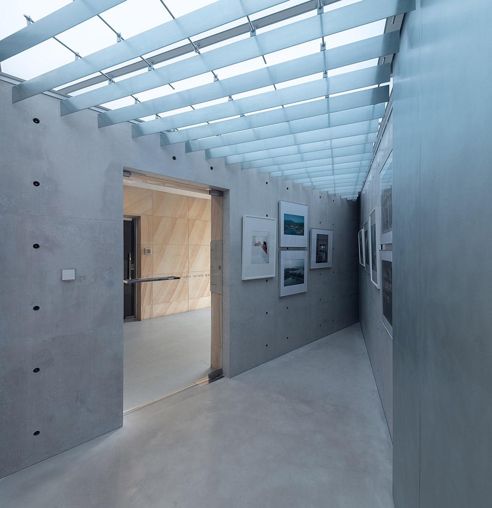 The vestibule of in-situ concrete at the entrance is arranged like a “contactless” showcase. Passersby may peer through the glass door, gaining a first impression of atelier mearc and scan the adjacent QR code if drawn to know more. With its understated presence, the vestibule creates a line of dialogue with the building.