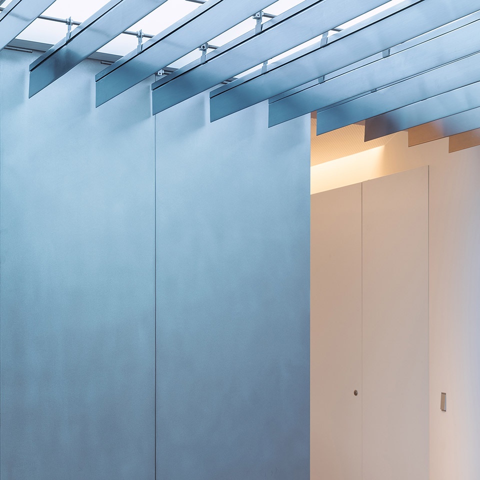 在环中商厦办公室已进行尝试的低能耗方案在这里得到完善和提升,另一方面,走进前厅即有一种往日情景闪现的怀旧感觉。钛锌板经重新切割后层叠排列覆于顶部,唤醒对“空的空间”的记忆。从地板、办公桌椅、书柜到部分开关、插座等都来自上一个办公室,接近一半的设备、材料和家具得到循环利用。