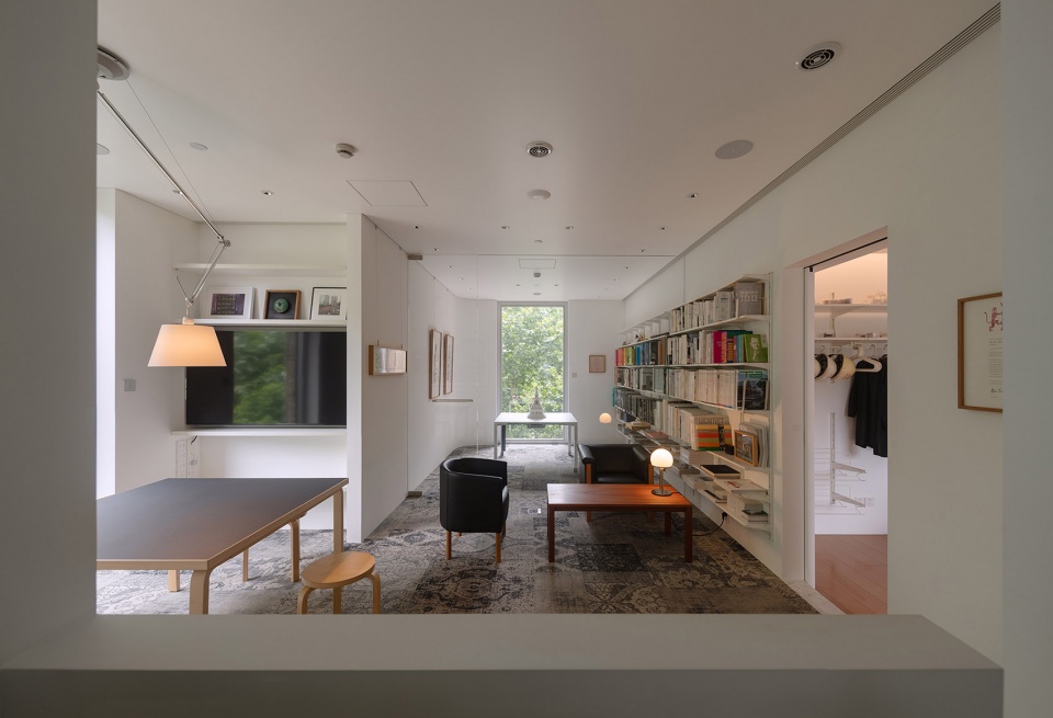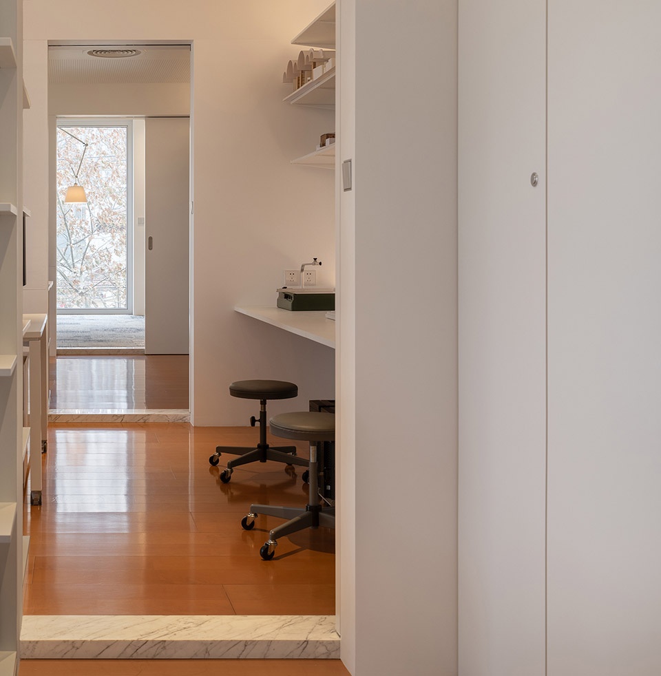 The raised floor and additional steps, combined with two full height windows, transform the space into a more open and enriched public area. The graceful presence of plane trees extend through the glass into living room, dawn and dusk, turning of the seasons, all unfold as part of the space itself. At night, interior light softly filters through the windows that brings dynamic experience.Along the west wall of the living room, a row of bookshelves from its first office on Yongjia Road was installed. This forms part of the project’s sustainable design while preserving an emotional continuity across time and space.