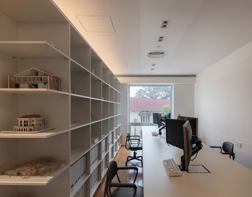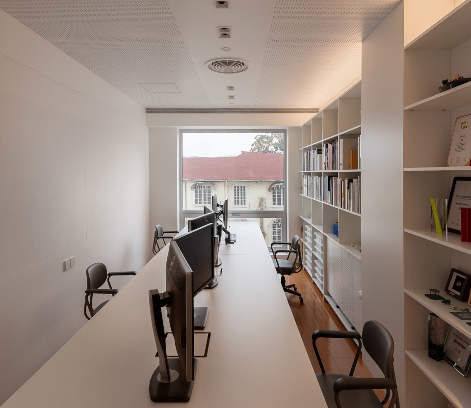 The low-energy strategies trialed at the previous office have been refined and improved here. Entering the vestibule evoke nostalgic memory. Recut titanium-zinc panels lines the ceiling, awaking the once “empty space.”Flooring, desks, chairs, bookshelves, and some switches and sockets are recycled from the previous office; nearly half of the equipment, materials, and furniture have been reused.