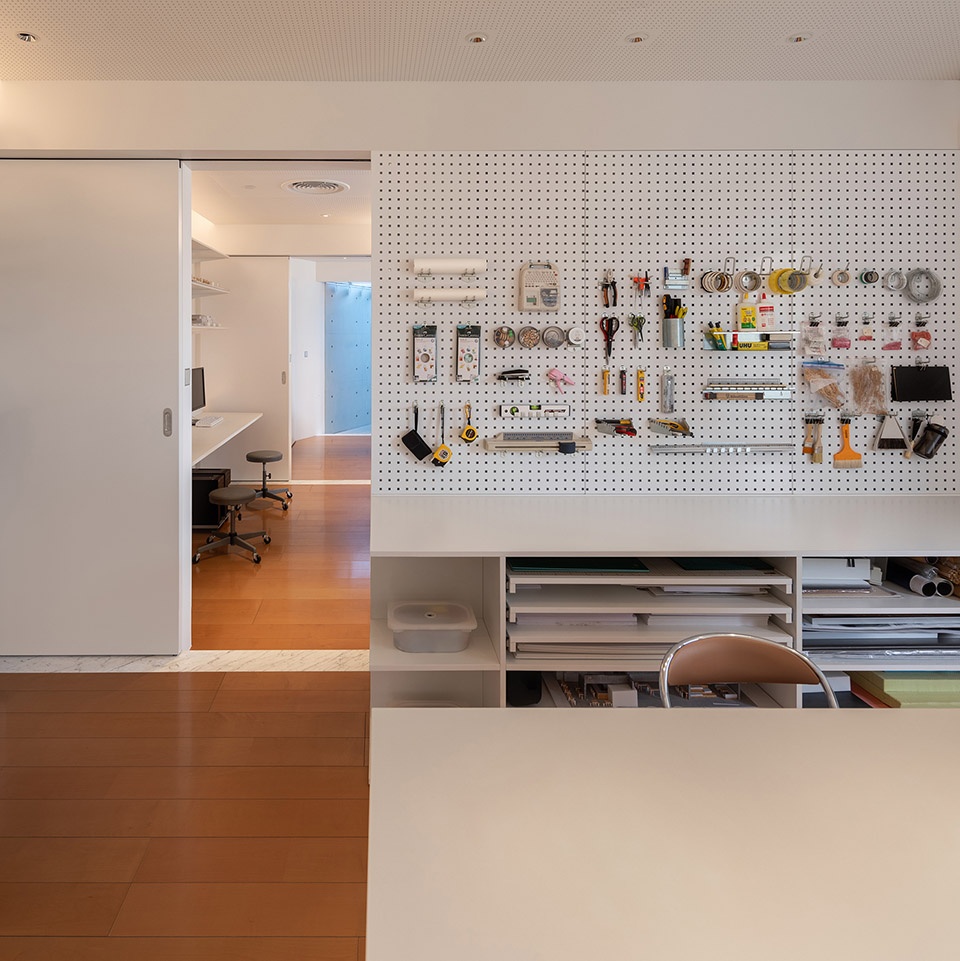 Located in the podium of the building, atelier mearc office is framed by two full height windows on its east and south sides. Just outside, two towering plane trees stand within arm reach that their crowns stretching to six or seven-story, and braches and leaves shimmering like amber in the afternoon sunshine. If the street represents the open public picture of the city, and the building a more enclosed semi-private community, the office sits between the two. It serves as a transitional space between the two, guiding the gaze from the street inward and then back out to the urban fabric. The podium shares the same structural system with the tower above, combining the scale of apartments with larger office layouts.