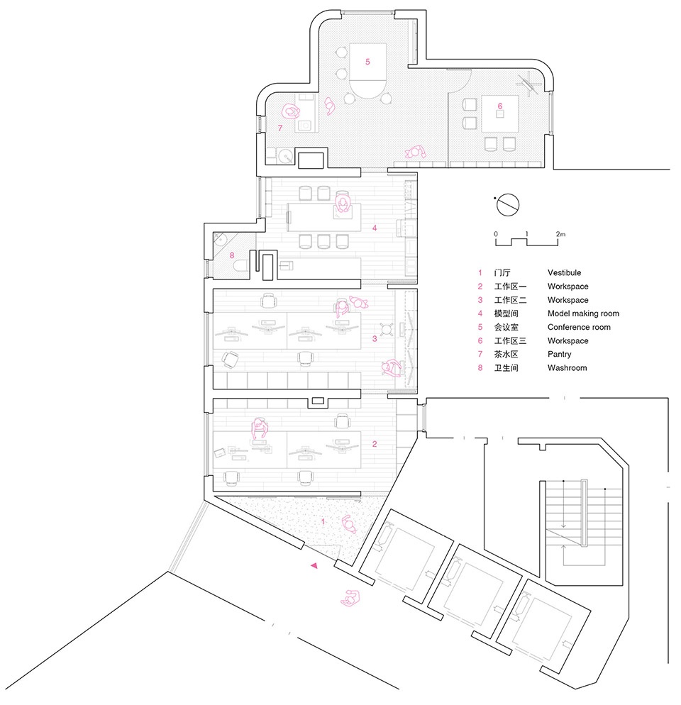 办公室功能以家具的方式被“后知”地置入空间。对已有的长桌、储物柜、模型桌、置物架等组合安排使单一空间功能模糊而可变。建筑秩序被作为高于平面合理性的规则对待,与城市关联的感受通过建筑形式获得。项目中包括材料和家具在内的可持续设计,是环中商厦办公室的延续;与街道和社区的连结让人想到康晖里那条“室内的茶陵路”;住宅和公共在X和Y轴上的体现像是对棠之酒店的呼应,而它现在就在这里,在繁茂的树荫与热闹的人群中,在襄阳南路。