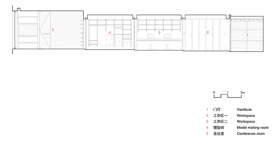 Office functions are “belatedly” integrated into the space by furniture setting. A series of existing furniture pieces such as long tables, storage units, model desk, shelves are combined, making the spatial functions ambiguous yet more flexible. Architectural order is treated as a rule above mere plan rationality, while urban connection is expressed through architectural form. The sustainable design principles applied in this project continue those of the previous office; the connection with the street and community recalls the “indoor Chaling Road” in Kanghui Community project; and the dialogue between residential and public spaces along the X and Y axes echoes “Begonia Inn”. Here it is, in the shades of thriving trees, surrounded by lively street life.