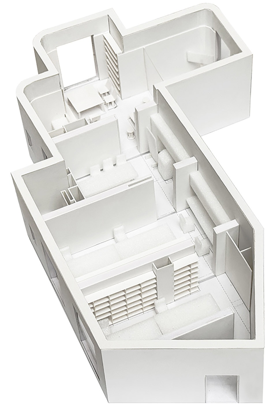 以入口的三角形空间为设计起点,自西向东依次生发出四个空间。建筑内原本南北向的居住空间活动路线被调整为东西向行进路线,穿越空间布局的同时融入住宅的亲切感觉与公共空间的开放感。与小三角入口平行,自西向东依次排开的三个空间保留与常规居住空间形态一致的层高,在获得亲切的身体尺度感受的同时,通过改变进入方式而得到完整的公共空间体验。