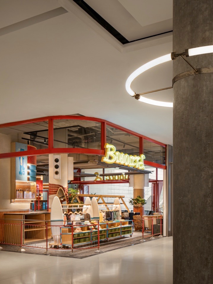 靠商场内的入口处为零售区,前方是使用蓝、红色的铝方管连接器加上万向轮组合而成的饰品区;后方的服饰区域,使用了两块呈45° 角度的冲浪板链接钢架作为衣架杆,加上吧台与吊柜延伸出来的收纳区域,再使用冲浪板形状的试衣镜,形成一个丰富多彩、轻松亲昵的零售氛围。