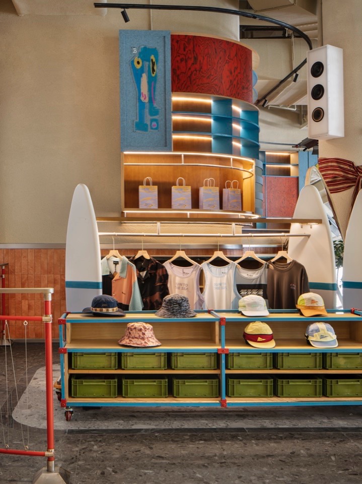 Near the mall entrance, the retail zone begins with a jewelry area featuring blue and red aluminum connectors and casters, followed by an apparel section where surfboards mounted at 45° angles serve as clothing racks. Together with storage extensions from the bar area and a surfboard-shaped fitting mirror, the retail space delivers a vibrant and inviting atmosphere.