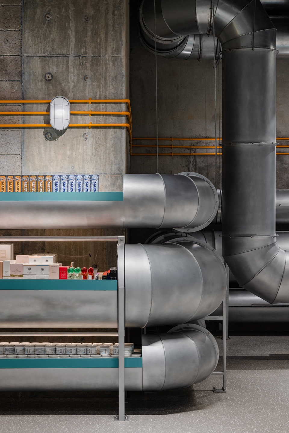 AIM采用复杂的管道系统作为店铺空间的核心元素,强化它对空间的串联作用,就像巨型结构光滑表皮下的毛细血管一样。镀锌钢管沿着内墙延伸,形成空间的边界;管道末端通过密集和分散的排布方式,形成交互界面。平行的管道系统之间创造了一个沉浸式的室内立面,而延伸至室外的管道则以恣意大胆的姿态,“入侵”公共空间,以诙谐的、实验性的语言,与其他邻接的店铺的沉稳纯粹形成鲜明对比。