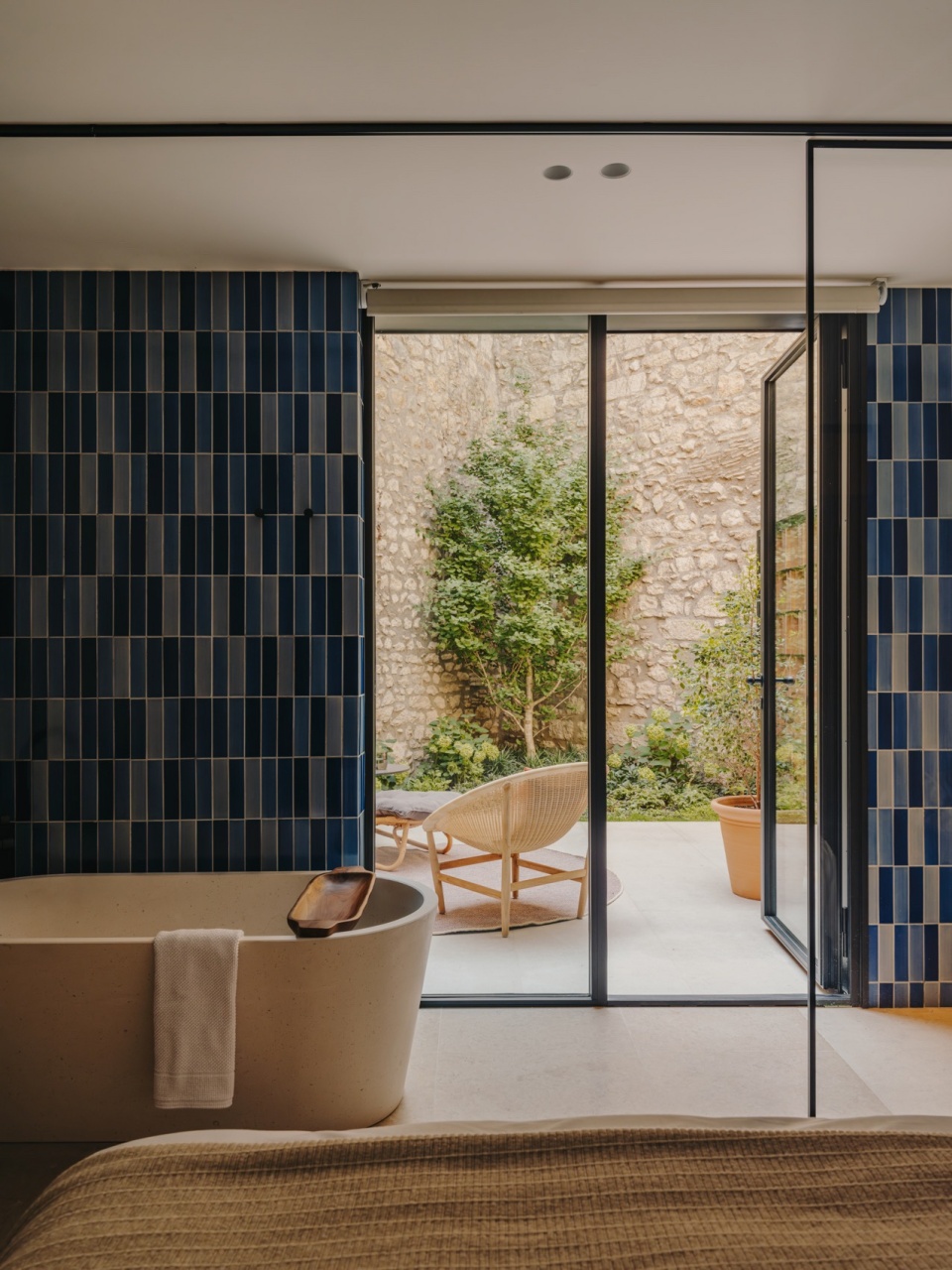 Adjacent to La Placeta is the reception room, where guests check in at a bespoke Yves Klein blue reception table overhung by a blossoming golden chandelier. This composition sets the tone for the rest of the hotel – a concept that balances history and modernity, formality and informality, and offers a unique and welcoming base while experiencing the rich history and culture of Girona.