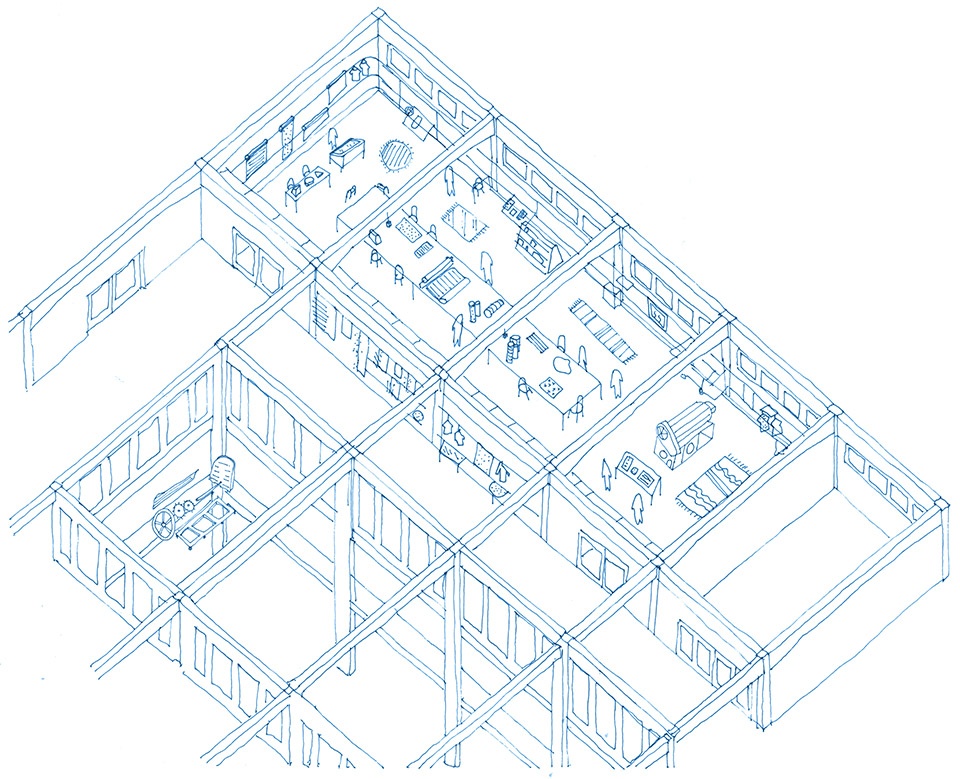 The former factory is overlaid with a new infrastructure in the form of a simple extruded aluminum profile system, which is coupled with custom components to create a set of furniture for working, archiving, storage and display of CHAT’s growing collection.