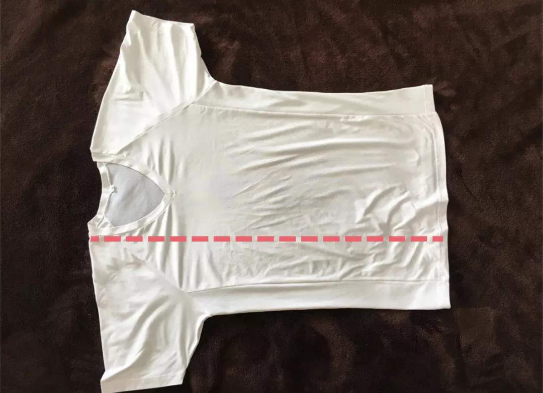 1.首先将T恤平铺,沿虚线位置将右侧袖子向中心线折;