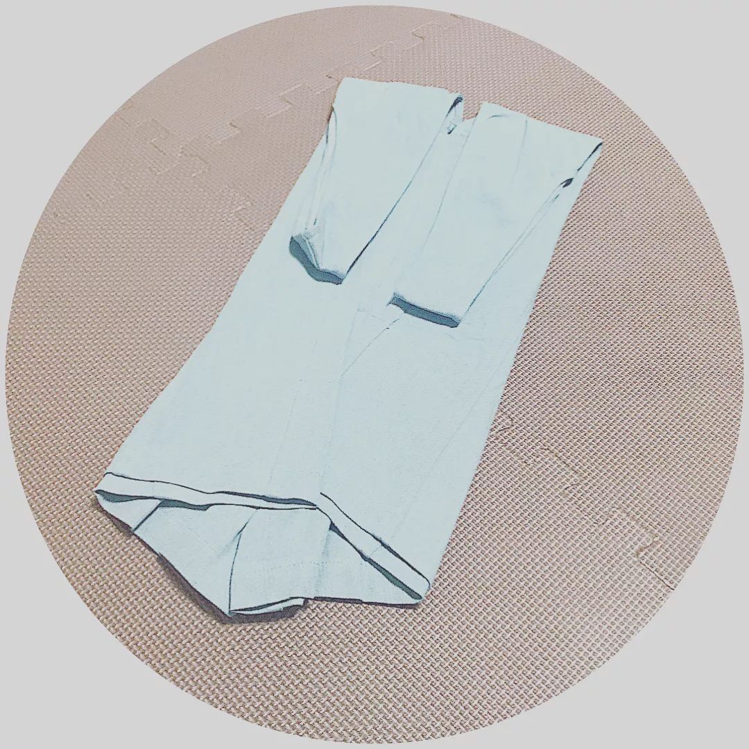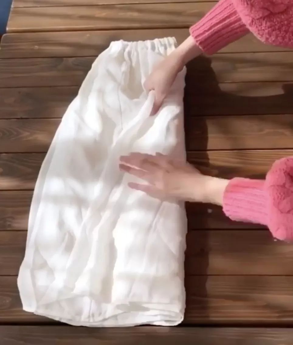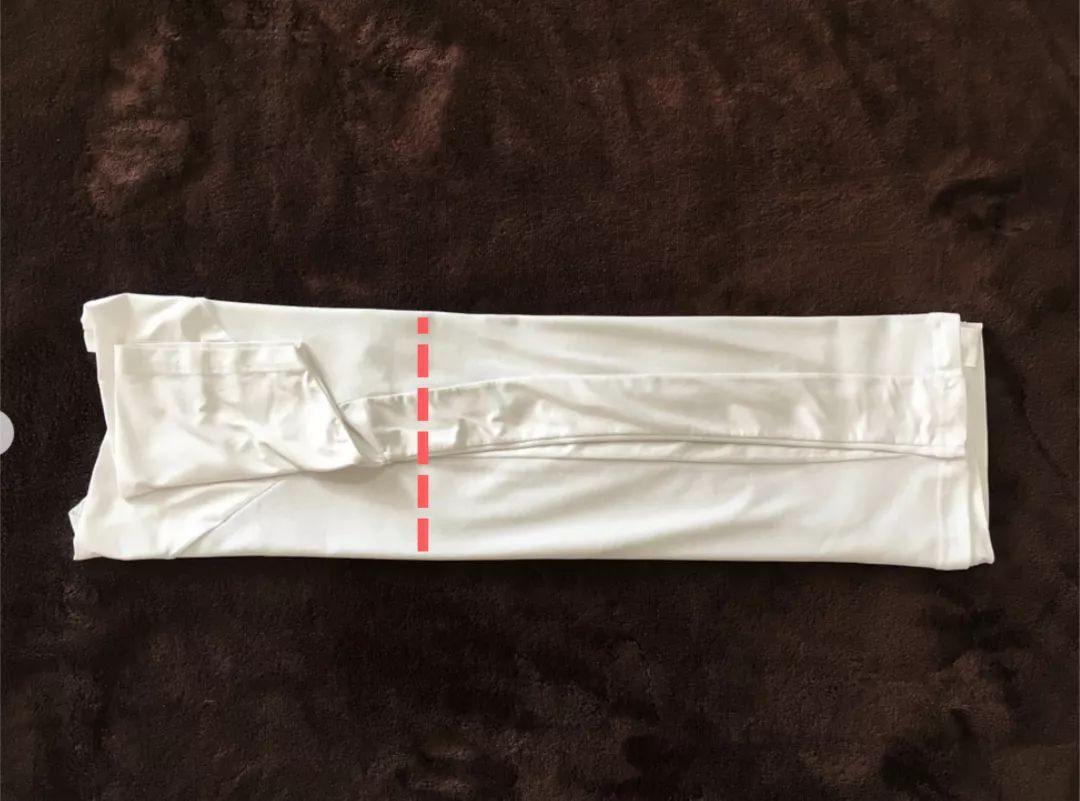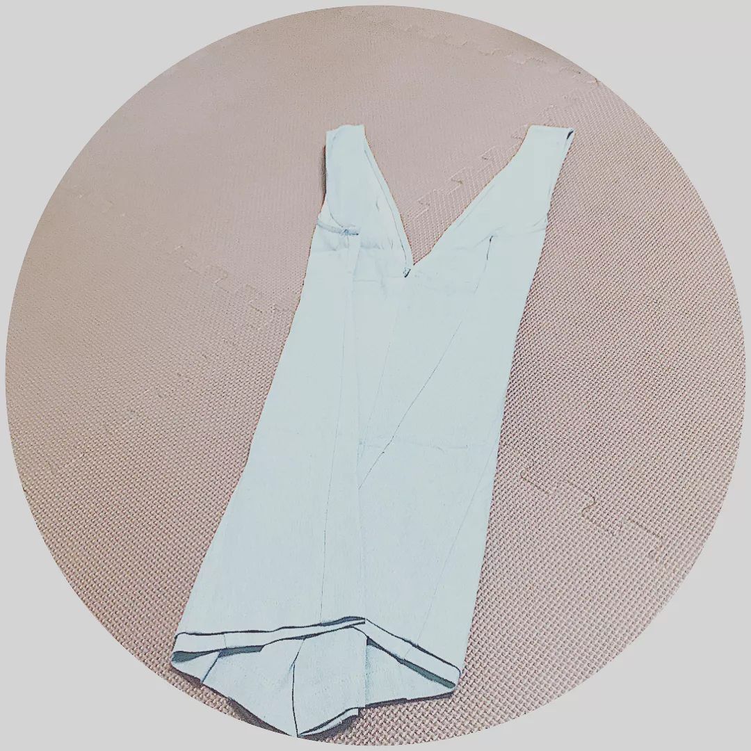 2.折到与肩同宽后,将背带内折,再将裙子进行对折,就不怕背带跑出来啦;