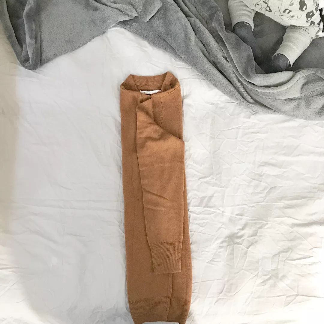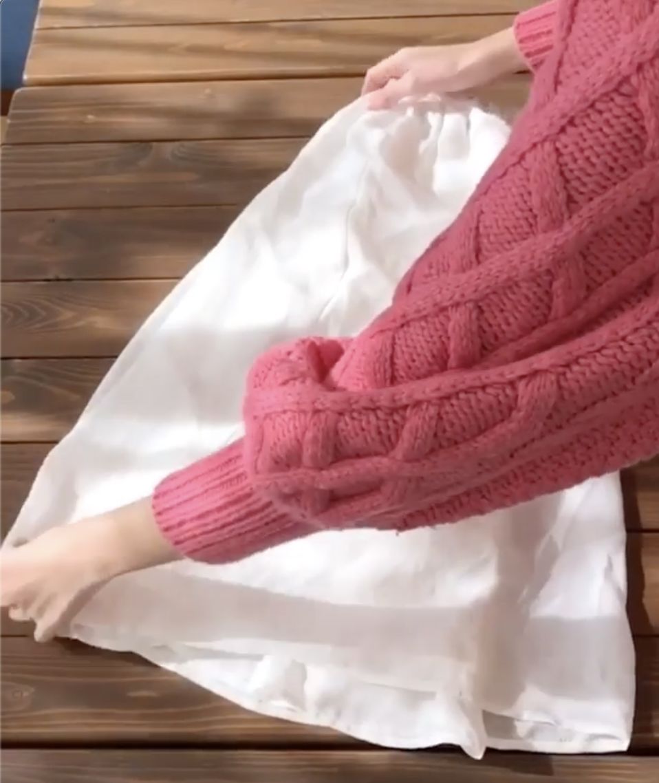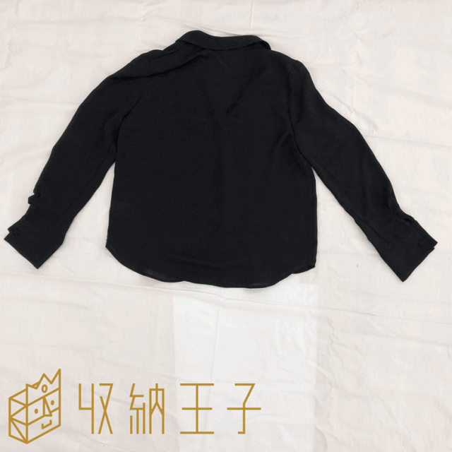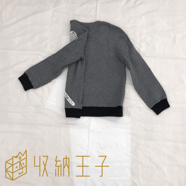 Tips:如果是不易变形的长袖衫,可以对折之后把衣领一侧的衣服塞进衣摆,这样做不易散开,适合装进旅行箱。