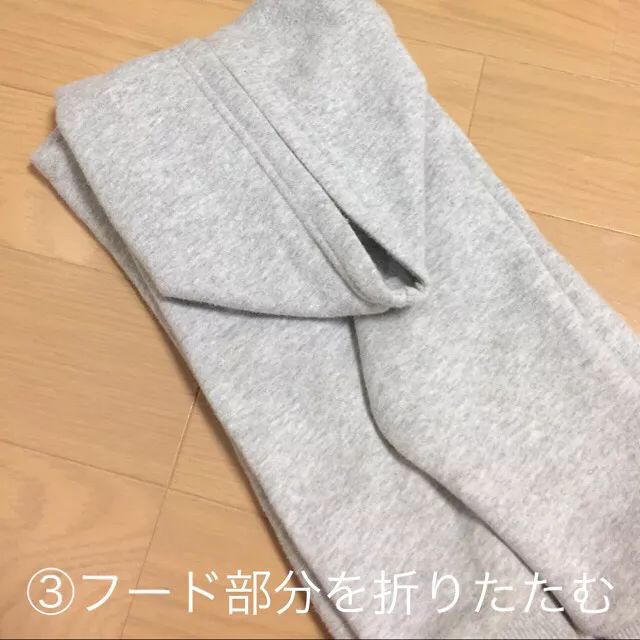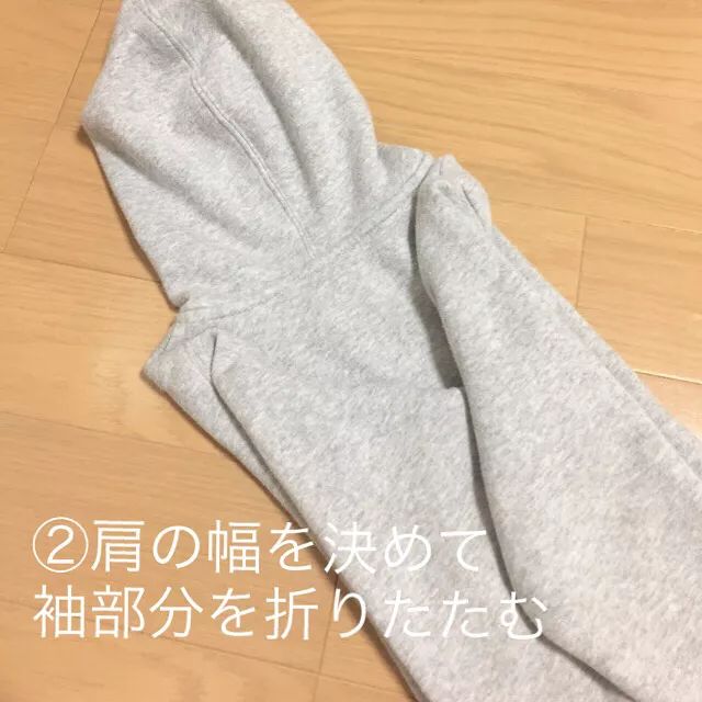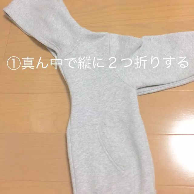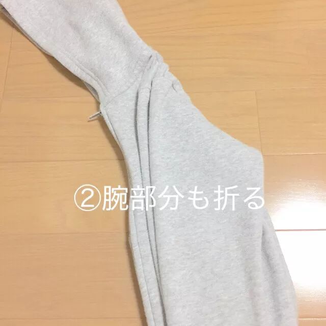 1.先把衣服沿着领口折过来,过长的袖子反过来折好;
