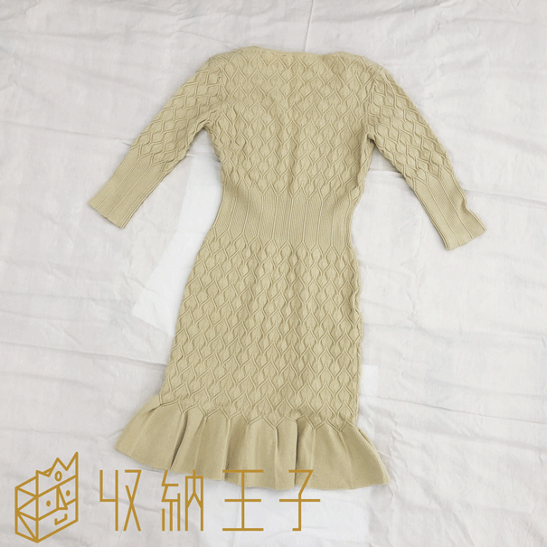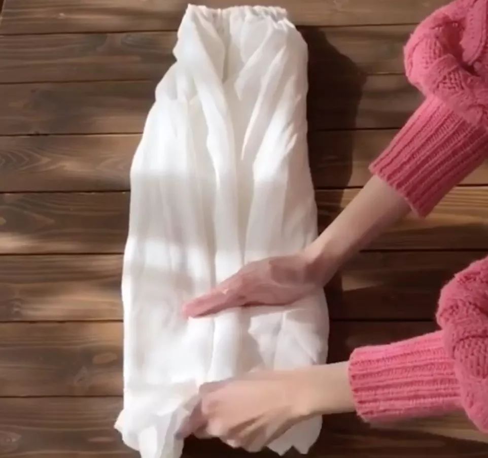 连衣裙折法与背带裙相似,都是先确定一个宽度,然后把过款的部分朝里折。