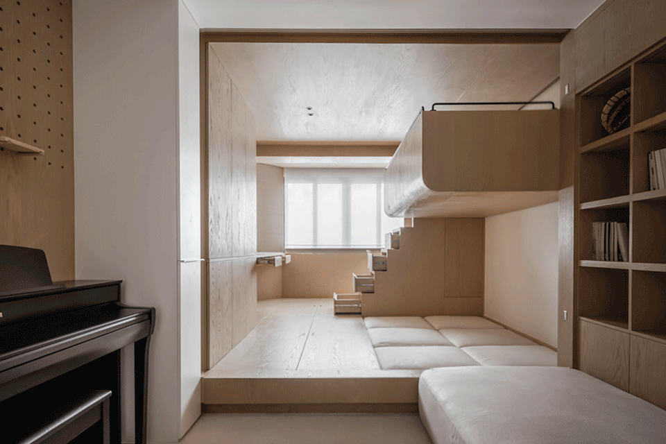 Therefore, in terms of spatial integration, we made a whole wall cabinet on the right hand side of the door. We followed the wooden bookshelf to feel a strong and regular sense of order, and then gaze moved to the wooden box area. The wooden box is divided into upper and lower floors. The small second floor is for children’s beds, and there is a cushioned seating area underneath. There is a children’s desk next to the window, and a work area on the other side, so that adults and children can work and study at the same time without interfering with each other. There is a hidden closed curtain outside the wooden box. After the curtain is pulled up, the inside becomes a self-contained space, which becomes the second bedroom. The wooden box is separated from the main public space and interspersed with the bookshelves, open the north-south space visually as a whole, breaking the original spatial plan.