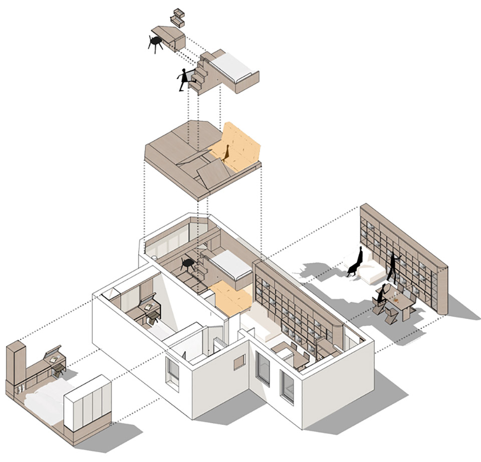 ▼书房、带夹层的儿童卧室、及可变为次卧(父母临时卧室)的客厅休闲区,the study, the children’s bedroom with a mezzanine, and the leisure area that can be turned into temporary bedroom ©木卡工作室
