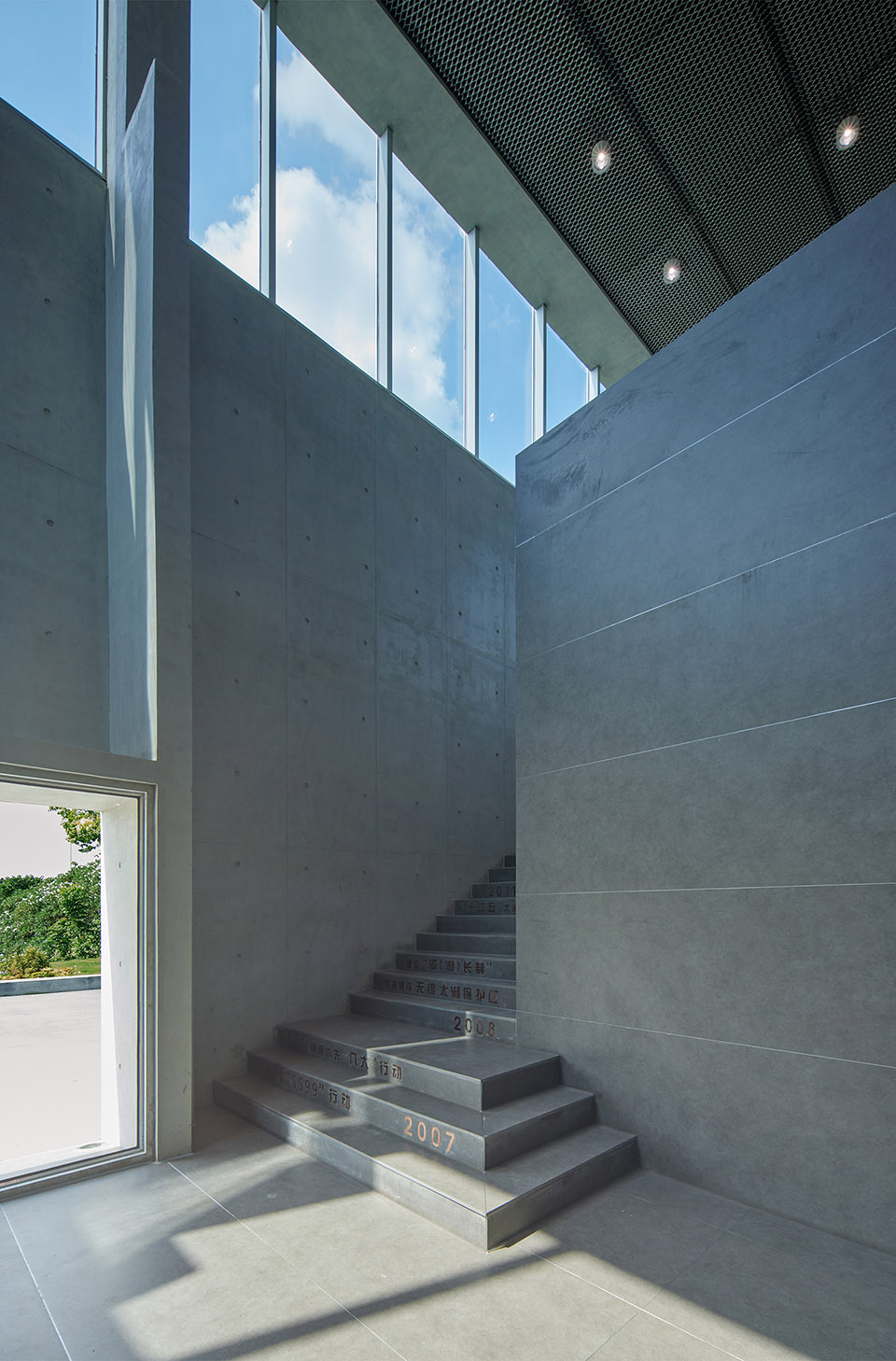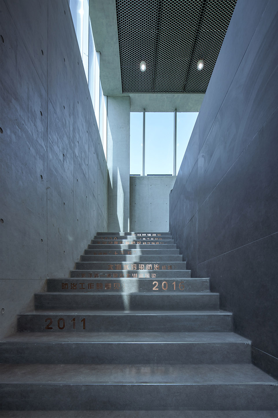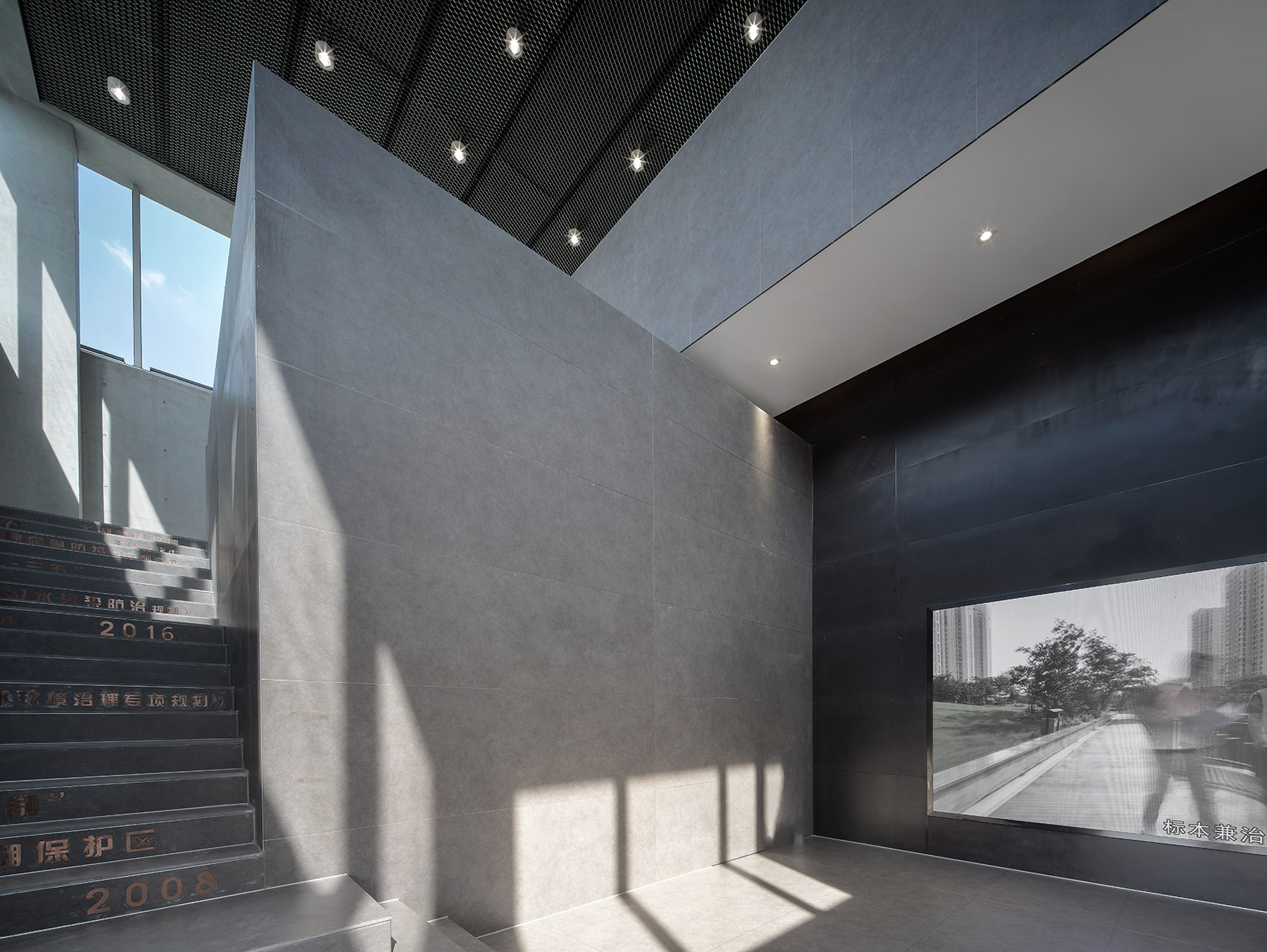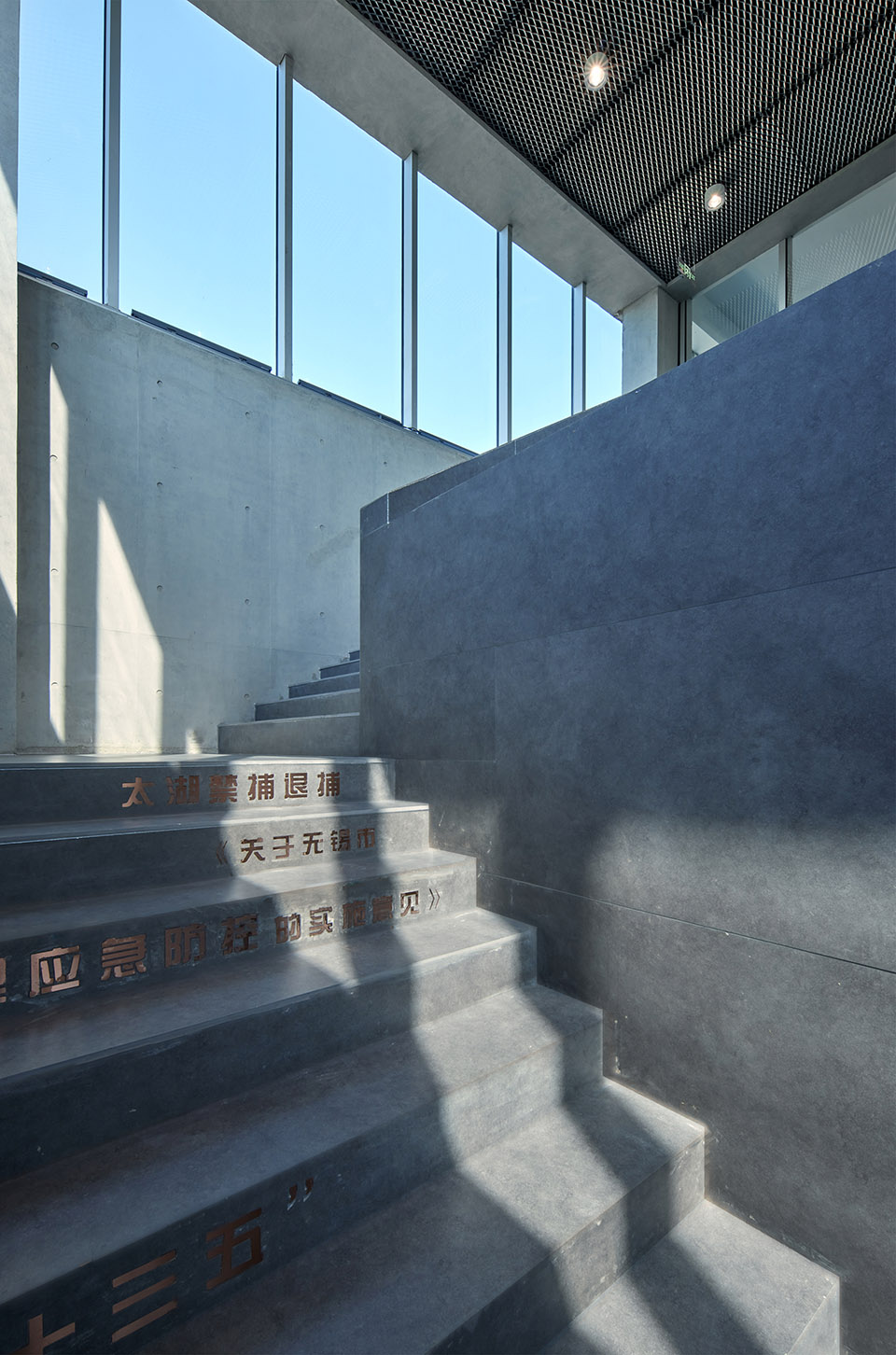 The dark gray slate extends through the stairs to the second floor exhibition hall, which strengthens the integrity and guidance of the space. The Wuxi Government’s means and determination to eliminate algae and manage Taihu Lake are engraved on the stairs in the way of engraving on a copper plate.