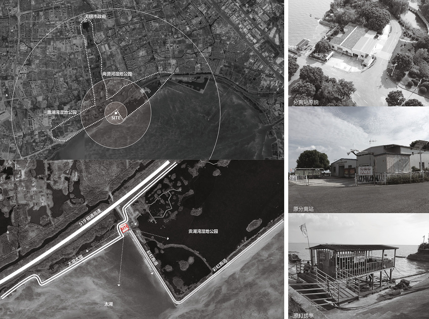 许仙港藻水分离站位于无锡市南端,美丽的贡湖湾湿地公园内,坐落于太湖之滨。而无锡夏日频繁爆发的蓝藻和盛行的东南风向,使基地周边成为太湖蓝藻的“重灾区”和“主战场”,2007年以来,无锡市政府始终坚定“除藻治太”行动,大力推进太湖流域生态共治。而场地中原分离站陈旧的设施无法满足日益增多的蓝藻治理需求,软硬件设施更新迫在眉睫。
