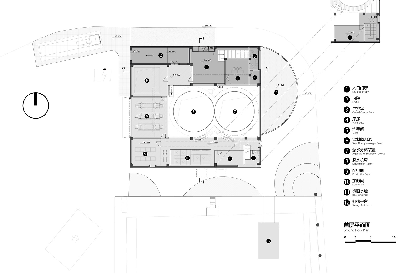 打捞作业与参观展示融为一体是本案设计的主要策略。在空间组织上,一层主要为除藻作业区,根据工业流程,高效有序地排布打捞设备;二层围绕作业区形成完整流畅的展示参观空间。通过平面功能与竖向交通的叠加组织,将公共、复合的理念呈现出来。