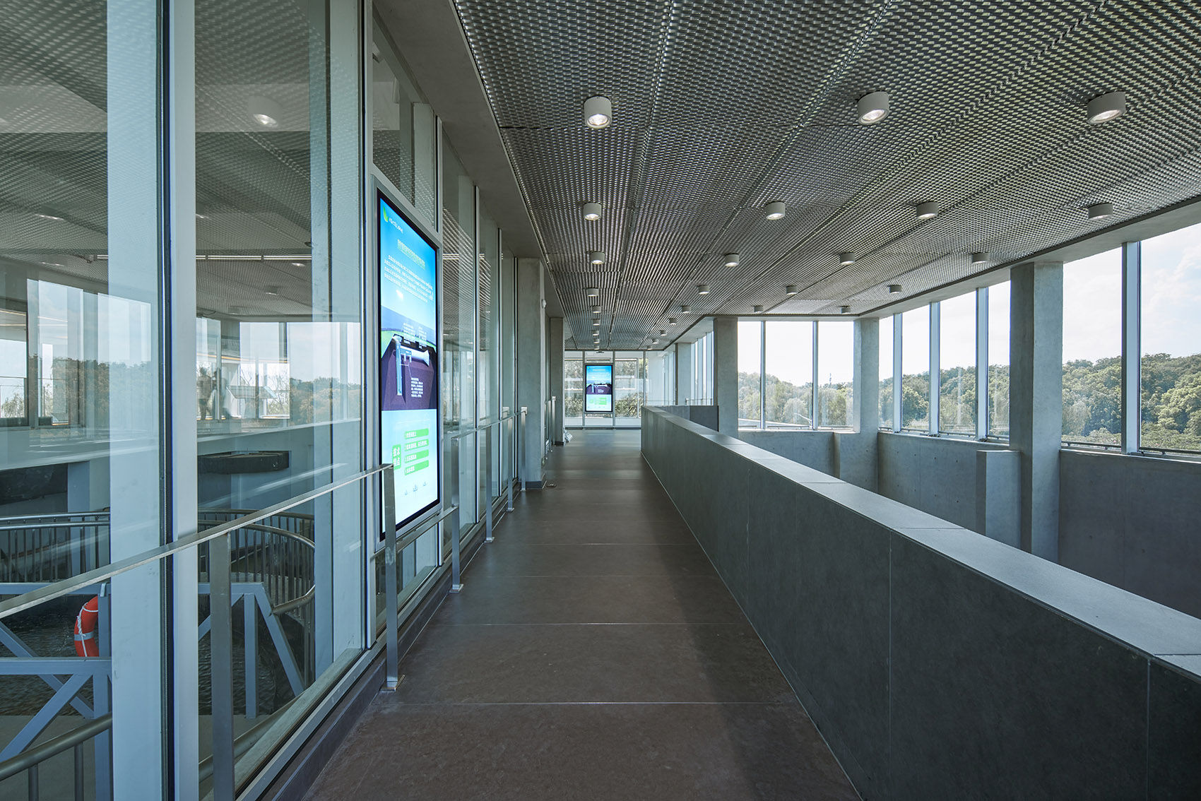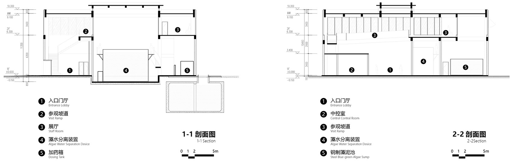 The second floor exhibition hall surrounding the equipment adopts transparent floor-to-ceiling window, and the algae removal process of each step is printed on the ice screen. Viewers can enter the second floor along the stairs and ramps, and watch the operation process of the algae-water separation and its graphic explanation.