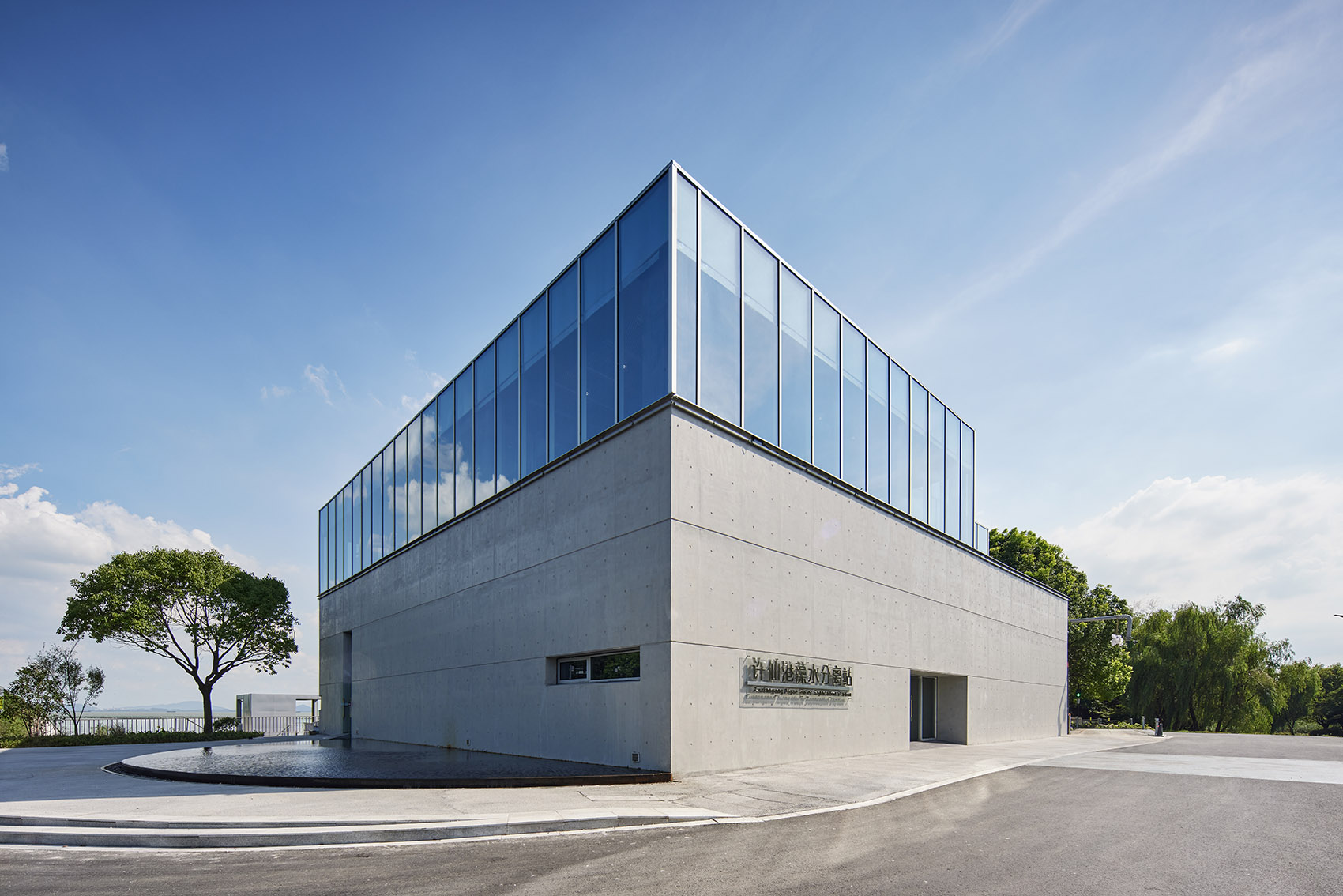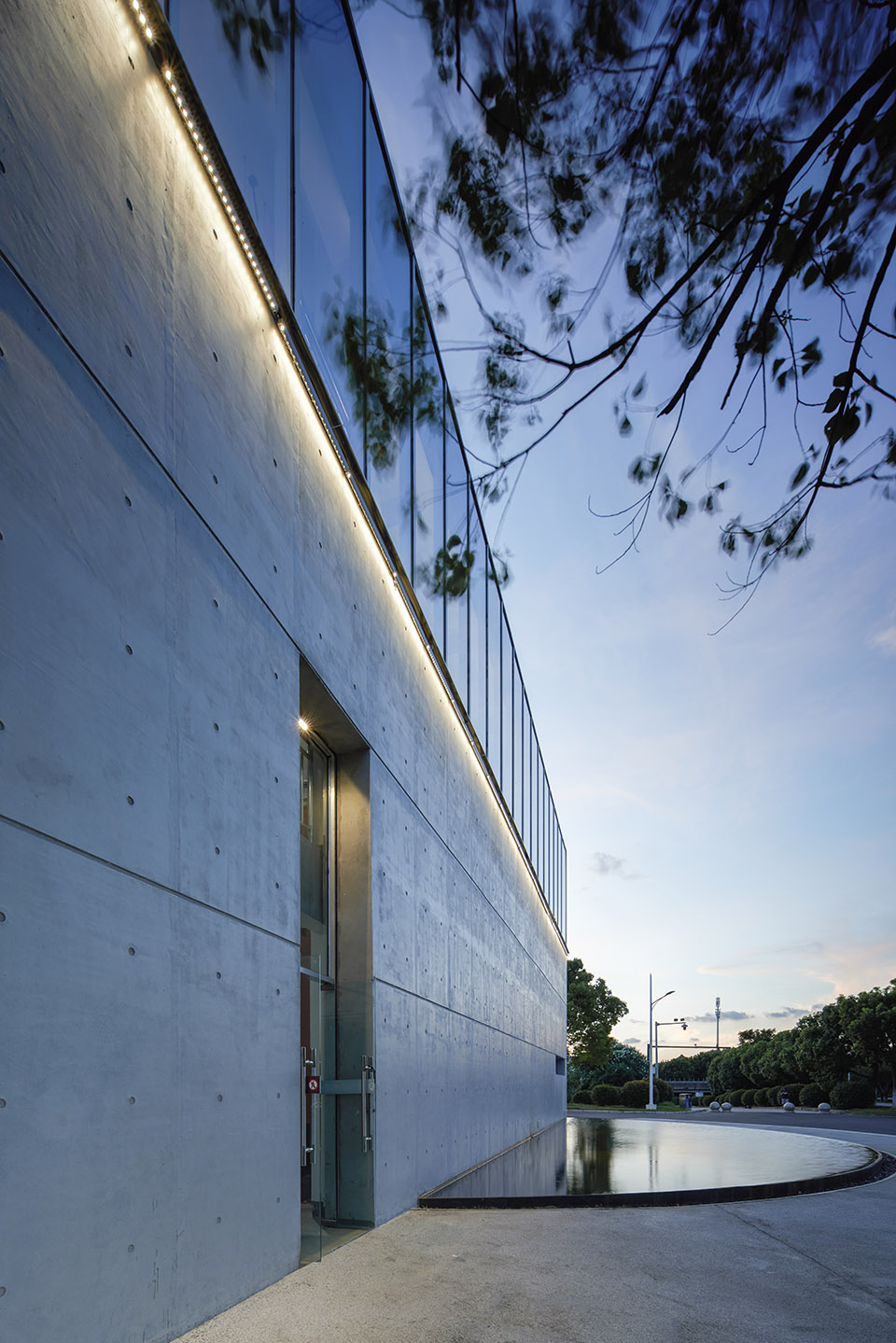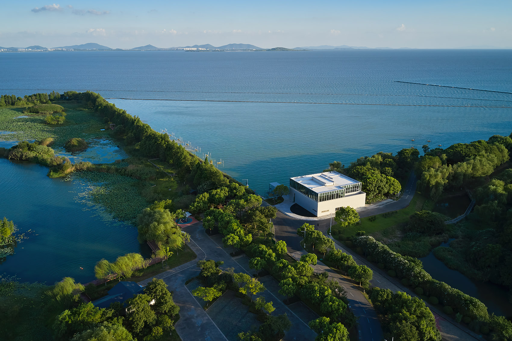 Located in the wetland park and on the bank of Taihu Lake, the best expression of the architecture in a humble and low-key posture. Therefore, the appearance and form of the architecture adopt the cleanest and concise language. The façade is composed of fair-faced concrete and the glass exterior wall, presenting the authentic beauty of the form and materials. The glass curtain wall wraps the beam and column structure, and the glass corresponds to the width of the fair-faced concrete formwork, making the building present a rigorous, pure, and concise modern beauty. The semicircular mirror pool surrounds the east side of the building and mirrors the plain and clean concrete wall.