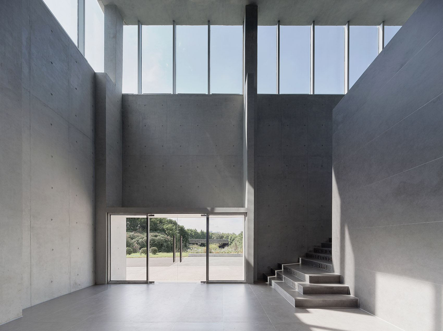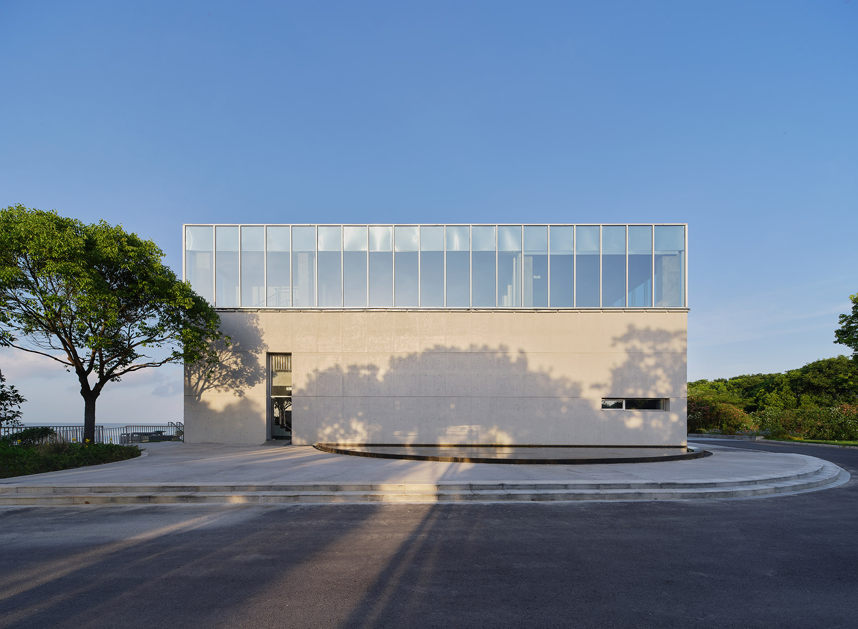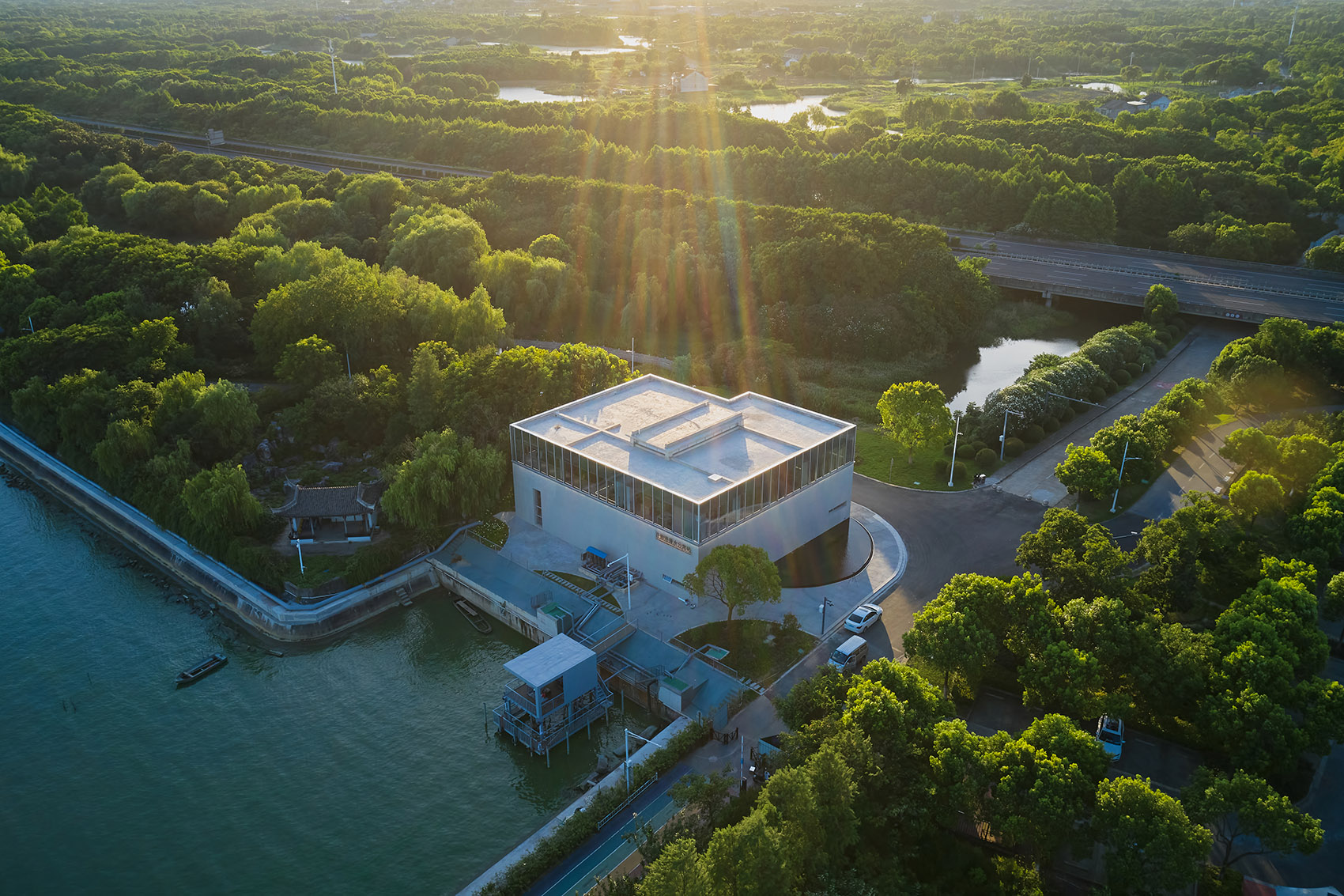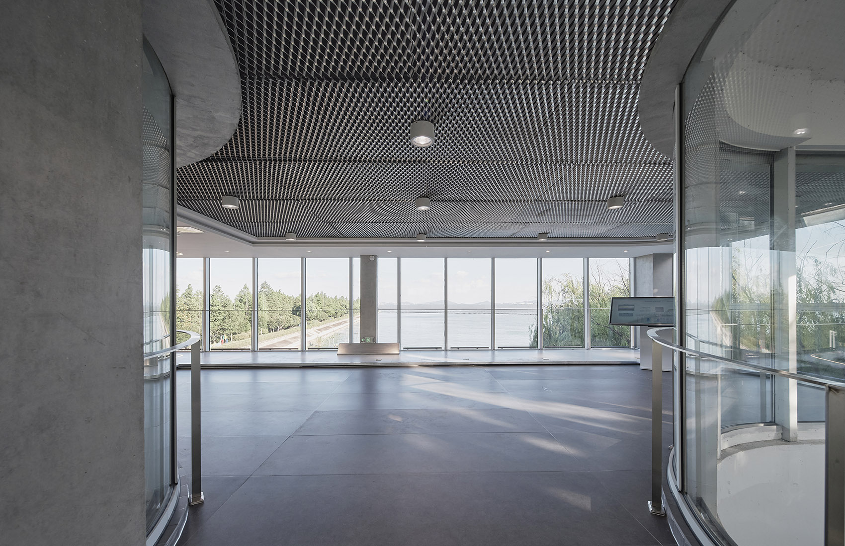 Located in the wetland park and on the bank of Taihu Lake, the best expression of the architecture in a humble and low-key posture. Therefore, the appearance and form of the architecture adopt the cleanest and concise language. The façade is composed of fair-faced concrete and the glass exterior wall, presenting the authentic beauty of the form and materials. The glass curtain wall wraps the beam and column structure, and the glass corresponds to the width of the fair-faced concrete formwork, making the building present a rigorous, pure, and concise modern beauty. The semicircular mirror pool surrounds the east side of the building and mirrors the plain and clean concrete wall.