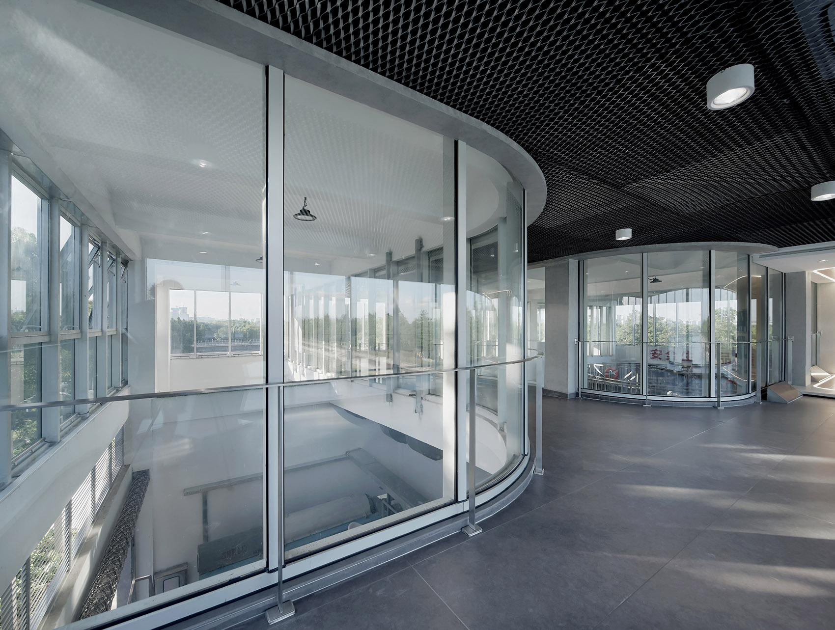 ▼环绕设备的二层展厅采用通透的落地玻璃窗,The second floor exhibition hall surrounding the equipment adopts transparent floor-to-ceiling window ©MLEE STUDIO