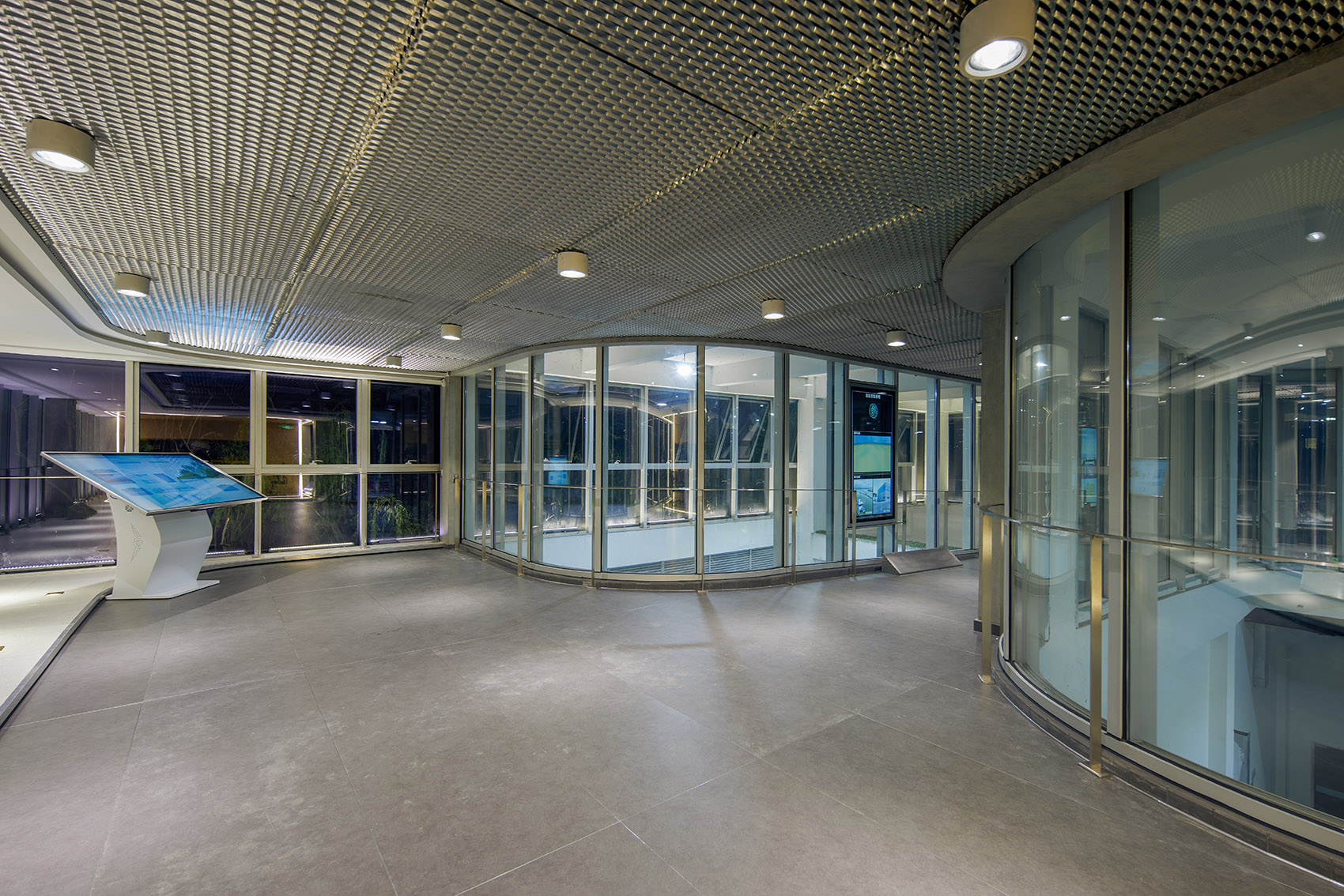 环绕设备的二层展厅采用通透的落地玻璃窗,并将各个步骤的除藻工艺流程印刻在冰屏上,沿着楼梯和坡道进入二层,可观看到藻水分离的操作过程及其图文解说。